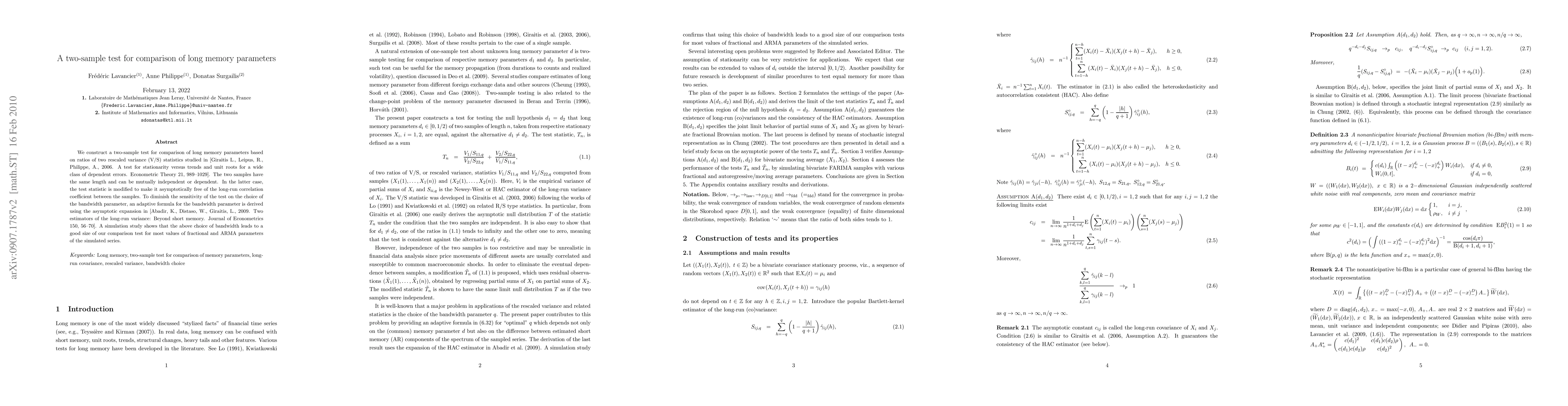 We construct a two-sample test for comparison of long memory parameters based on ratios of two rescaled variance (V/S) statistics studied in [Giraitis L., Leipus, R., Philippe, A., 2006. A test for stationarity versus trends and unit roots for a wide class of dependent errors. Econometric Theory 21, 989--1029]. The two samples have the same length and can be mutually independent or dependent. In the latter case, the test statistic is modified to make it asymptotically free of the long-run correlation coefficient between the samples. To diminish the sensitivity of the test on the choice of the bandwidth parameter, an adaptive formula for the bandwidth parameter is derived using the asymptotic expansion in [Abadir, K., Distaso, W., Giraitis, L., 2009. Two estimators of the long-run variance: Beyond short memory. Journal of Econometrics 150, 56--70]. A simulation study shows that the above choice of bandwidth leads to a good size of our comparison test for most values of fractional and ARMA parameters of the simulated series.
