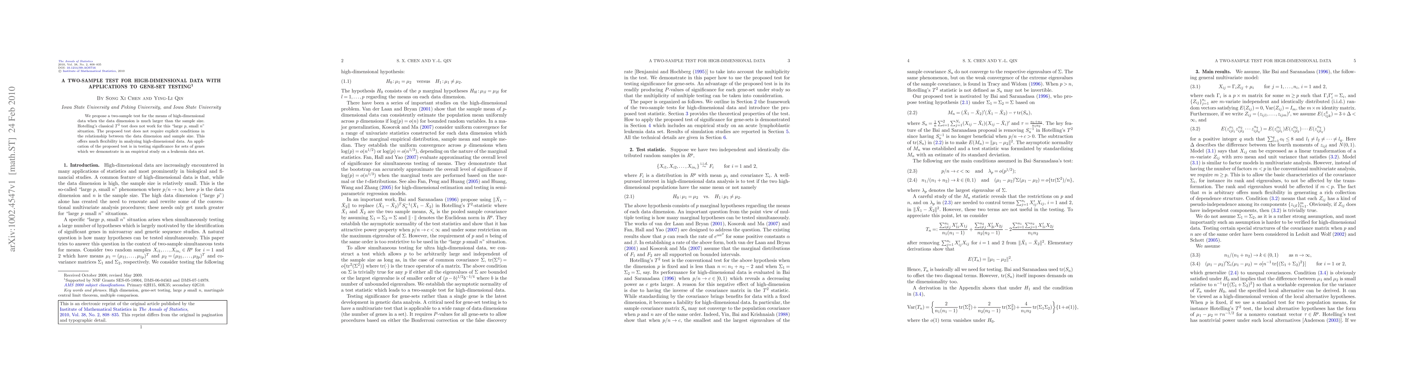 Summary: This paper introduces a novel two-sample test for high-dimensional data with no strict conditions on the relationship between data dimension and sample size, offering flexibility for "large $p$, small $n$" scenarios. The method is applied to gene-set testing, demonstrated through an empirical study on a leukemia dataset.