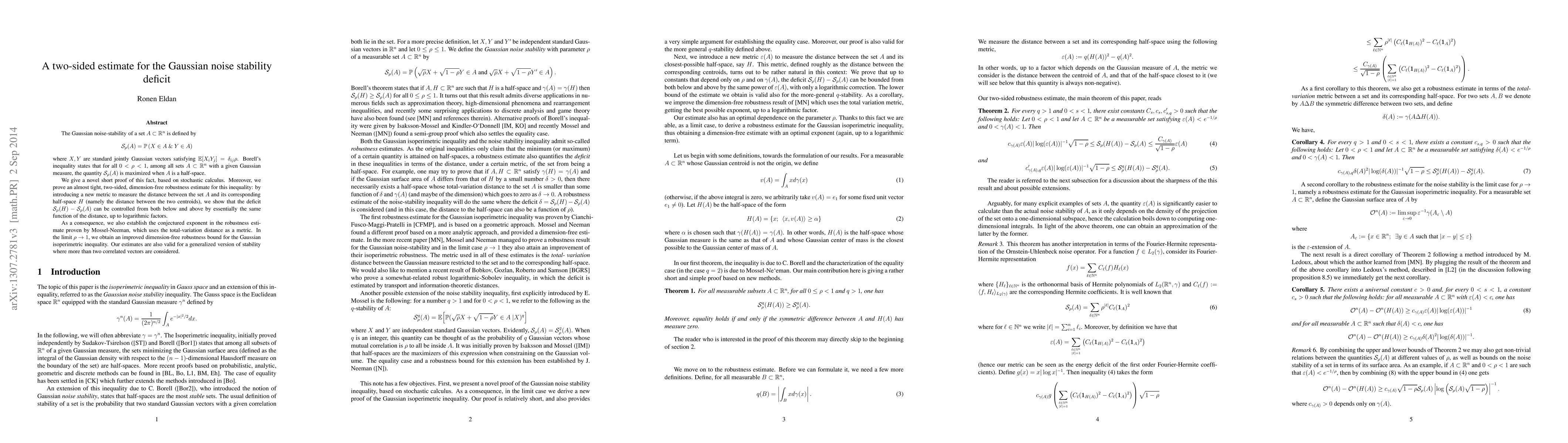 The Gaussian noise-stability of a set A in R^n is defined by S_rho(A) = P (X in A and Y in A) where X and Y are standard Gaussian vectors whose correlation is rho. Borell's inequality states that for all 0 < rho < 1, among all sets A with a given Gaussian measure, the quantity S_rho(A) is maximized when A is a half-space. We give a novel short proof of this fact, based on stochastic calculus. Moreover, we prove an almost tight, two-sided, dimension-free robustness estimate for this inequality: by introducing a new metric to measure the distance between the set A and its corresponding half-space H (namely the distance between the two centroids), we show that the deficit S_rho(H) - S_rho(A) can be controlled from both below and above by essentially the same function of the distance, up to logarithmic factors. As a consequence, we also establish the conjectured exponent in the robustness estimate proven by Mossel-Neeman, which uses the total-variation distance as a metric. In the limit rho->1, we get an improved dimension free robustness bound for the Gaussian isoperimetric inequality. Our estimates are also valid for a the more general version of stability where more than two correlated vectors are considered.