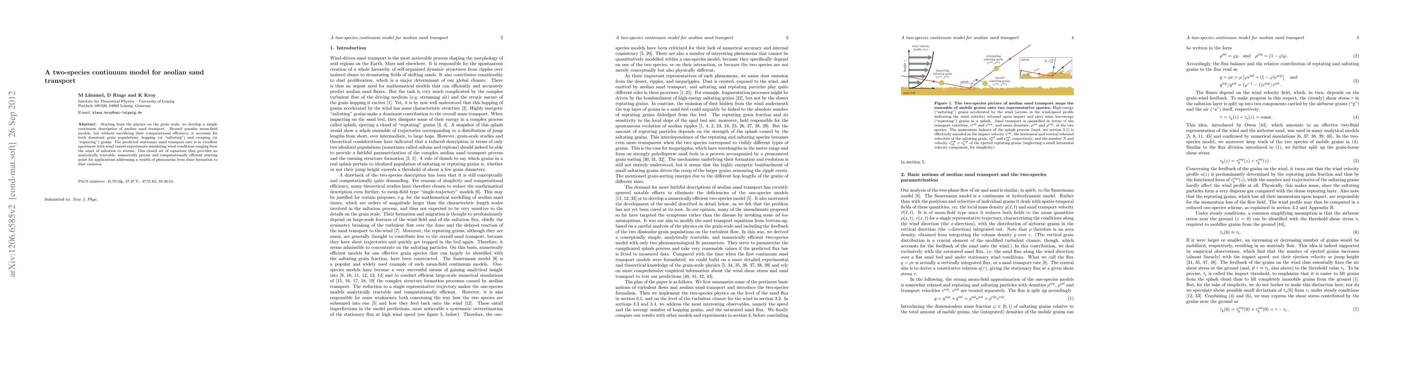 This paper develops a two-species continuum model for aeolian sand transport, accounting for both saltating and reptating grains, and shows excellent agreement with wind tunnel experiments. The model offers a balance between analytical tractability, numerical precision, and computational efficiency for applications like dune formation and dust emission.