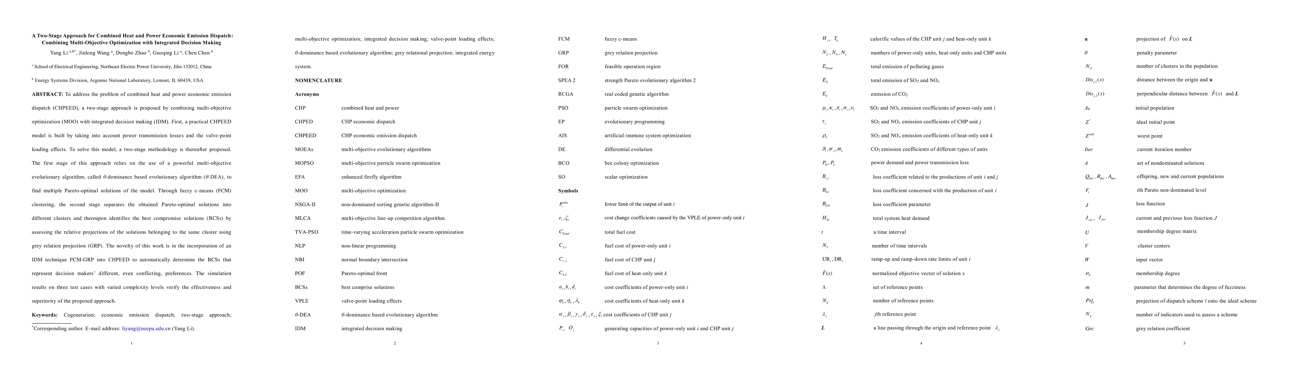 This paper proposes a two-stage approach for combined heat and power economic emission dispatch (CHPEED) using a multi-objective evolutionary algorithm and integrated decision making. The first stage employs a θ-DEA algorithm to find Pareto-optimal solutions, while the second stage uses fuzzy c-means clustering and grey relation projection to identify best compromise solutions, demonstrating effectiveness through simulations.