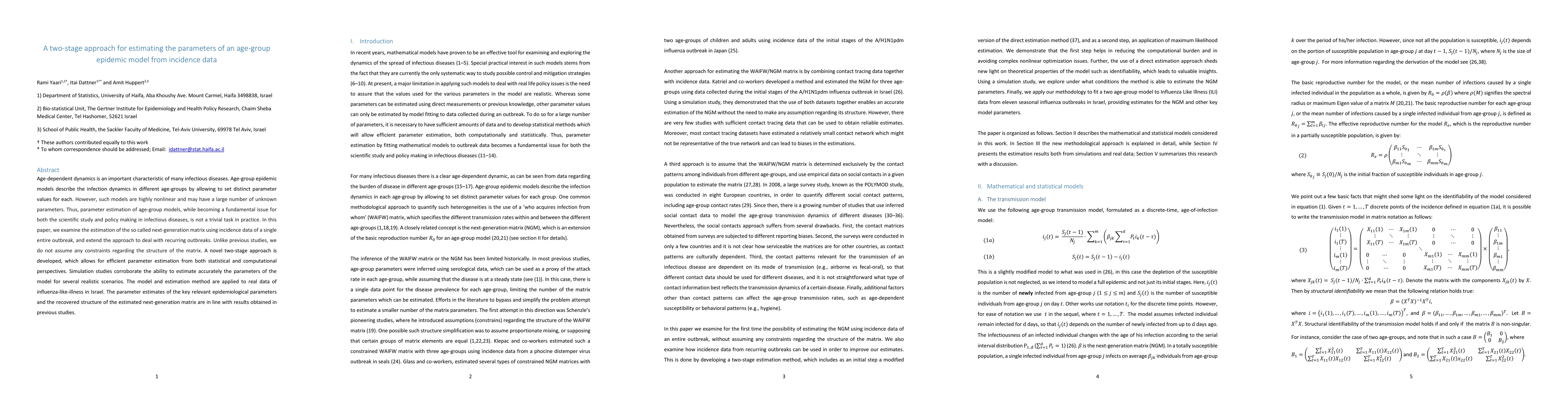 This paper proposes a two-stage approach for estimating parameters in age-group epidemic models using incidence data, without imposing structural constraints on the next-generation matrix. The method is validated through simulations and applied to real influenza-like-illness data in Israel, yielding results consistent with previous studies.