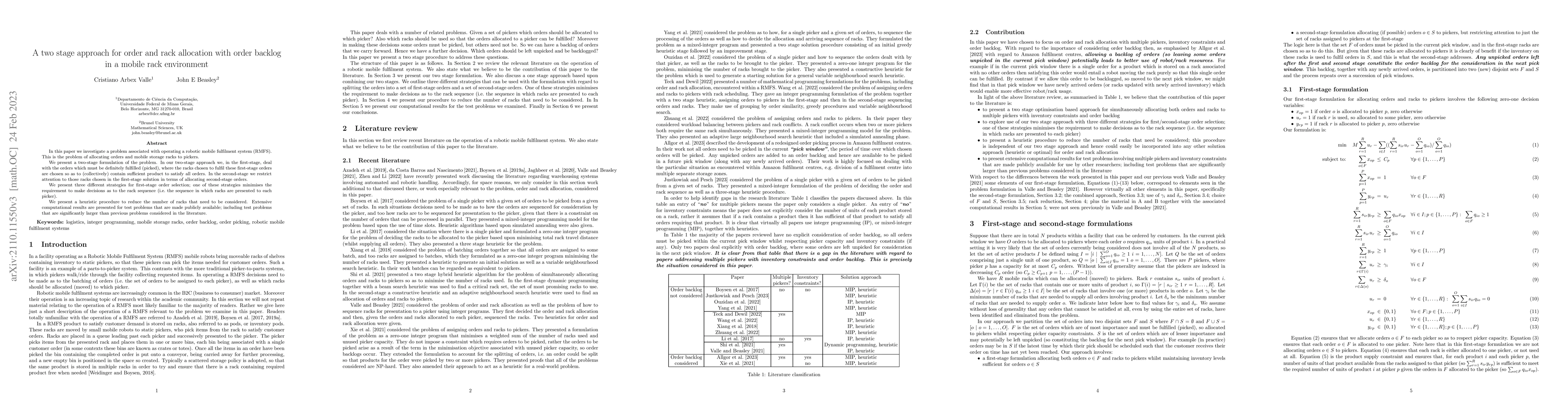In this paper we investigate a problem associated with operating a robotic mobile fulfilment system (RMFS). This is the problem of allocating orders and mobile storage racks to pickers. We present a two-stage formulation of the problem. In our two-stage approach we, in the first-stage, deal with the orders which must be definitely fulfilled (picked), where the racks chosen to fulfil these first-stage orders are chosen so as to (collectively) contain sufficient product to satisfy all orders. In the second-stage we restrict attention to those racks chosen in the first-stage solution in terms of allocating second-stage orders. We present three different strategies for first-stage order selection; one of these strategies minimises the requirement to make decisions as to the rack sequence (i.e. the sequence in which racks are presented to each picker). We present a heuristic procedure to reduce the number of racks that need to be considered. Extensive computational results are presented for test problems that are made publicly available; including test problems that are significantly larger than previous problems considered in the literature.