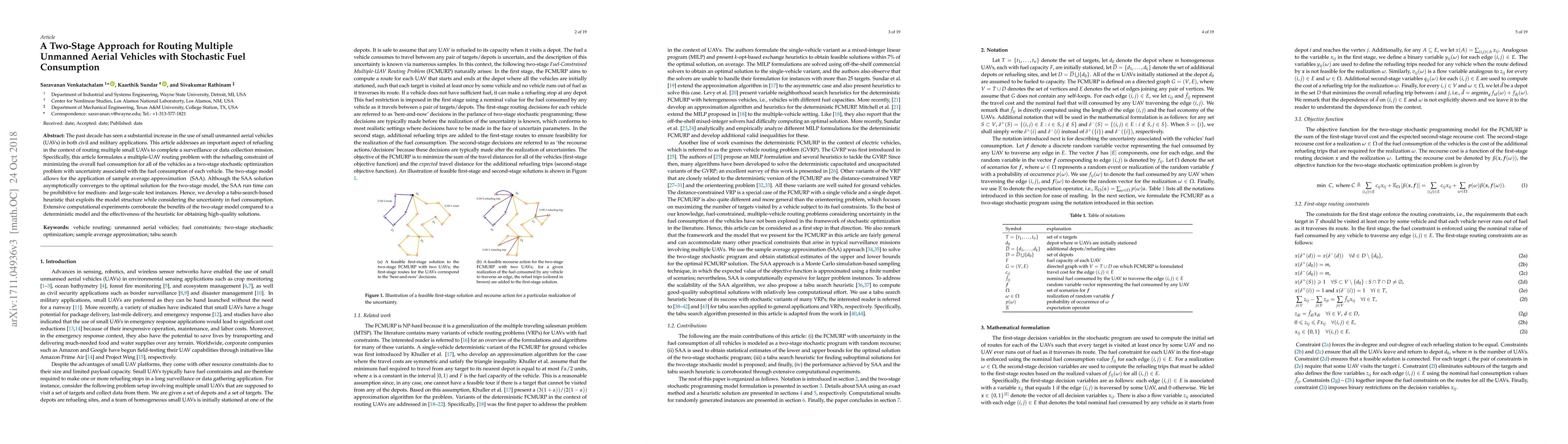 This paper proposes a two-stage stochastic optimization model to minimize fuel consumption for routing multiple UAVs, incorporating uncertainty in fuel usage. It also develops a tabu-search heuristic to efficiently solve medium- and large-scale instances, demonstrating its effectiveness through computational experiments.
