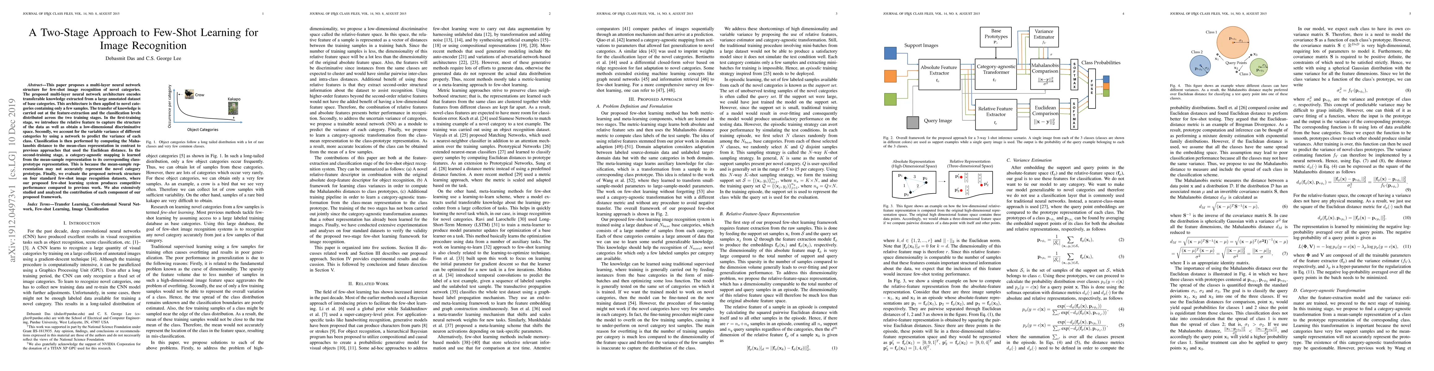 This paper introduces a two-stage neural network for few-shot image recognition, utilizing a multi-layer architecture to transfer knowledge from base categories to novel ones. The approach employs relative features and Mahalanobis distance for improved classification, achieving competitive results on standard datasets.