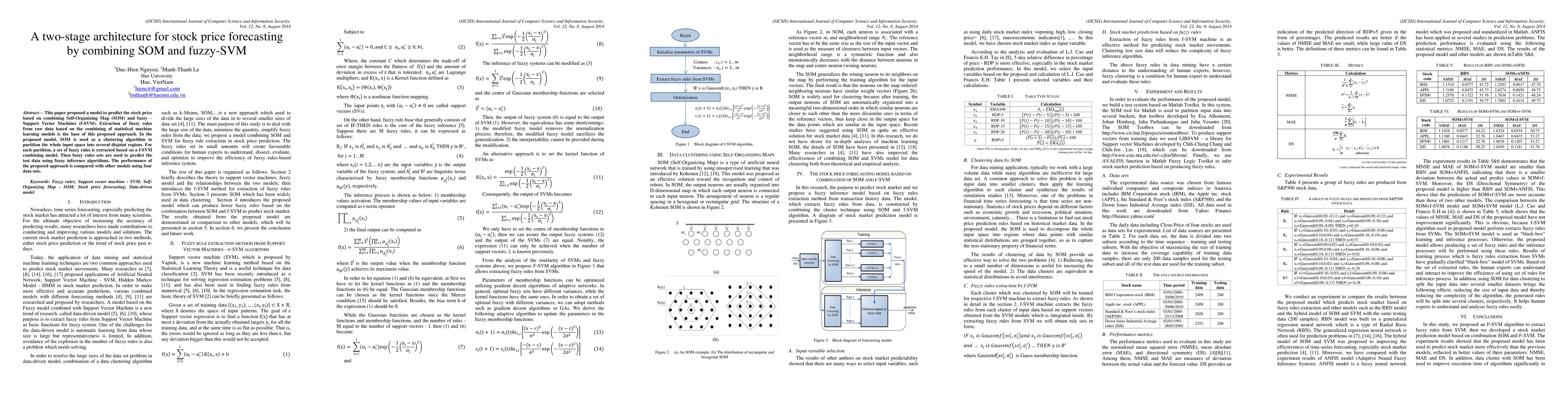 This paper proposes a two-stage stock price forecasting model combining Self-Organizing Maps (SOM) for clustering and fuzzy-Support Vector Machines (f-SVM) for rule extraction. The model uses SOM to partition the input space and f-SVM to derive fuzzy rules, which are then applied for stock price predictions. The approach's performance is evaluated against other models using four datasets.
