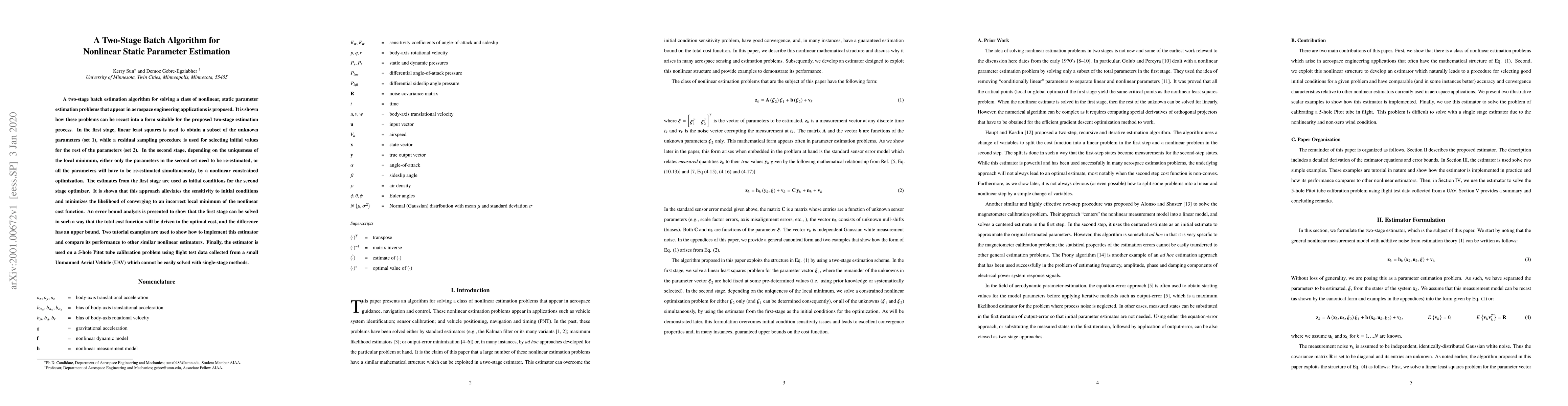 A two-stage batch estimation algorithm for solving a class of nonlinear, static parameter estimation problems that appear in aerospace engineering applications is proposed. It is shown how these problems can be recast into a form suitable for the proposed two-stage estimation process. In the first stage, linear least squares is used to obtain a subset of the unknown parameters (set 1), while a residual sampling procedure is used for selecting initial values for the rest of the parameters (set 2). In the second stage, depending on the uniqueness of the local minimum, either only the parameters in the second set need to be re-estimated, or all the parameters will have to be re-estimated simultaneously, by a nonlinear constrained optimization. The estimates from the first stage are used as initial conditions for the second stage optimizer. It is shown that this approach alleviates the sensitivity to initial conditions and minimizes the likelihood of converging to an incorrect local minimum of the nonlinear cost function. An error bound analysis is presented to show that the first stage can be solved in such a way that the total cost function will be driven to the optimal cost, and the difference has an upper bound. Two tutorial examples are used to show how to implement this estimator and compare its performance to other similar nonlinear estimators. Finally, the estimator is used on a 5-hole Pitot tube calibration problem using flight test data collected from a small Unmanned Aerial Vehicle (UAV) which cannot be easily solved with single-stage methods.