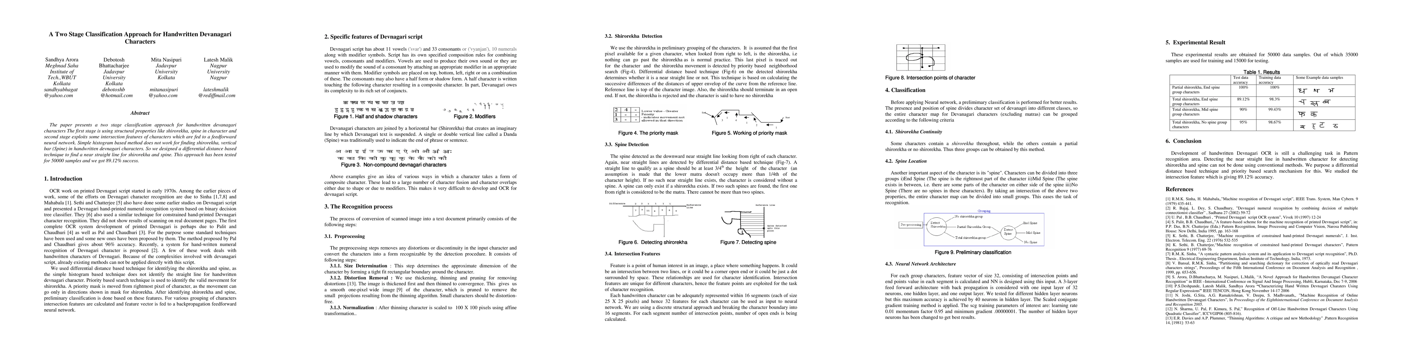 The paper presents a two stage classification approach for handwritten devanagari characters The first stage is using structural properties like shirorekha, spine in character and second stage exploits some intersection features of characters which are fed to a feedforward neural network. Simple histogram based method does not work for finding shirorekha, vertical bar (Spine) in handwritten devnagari characters. So we designed a differential distance based technique to find a near straight line for shirorekha and spine. This approach has been tested for 50000 samples and we got 89.12% success