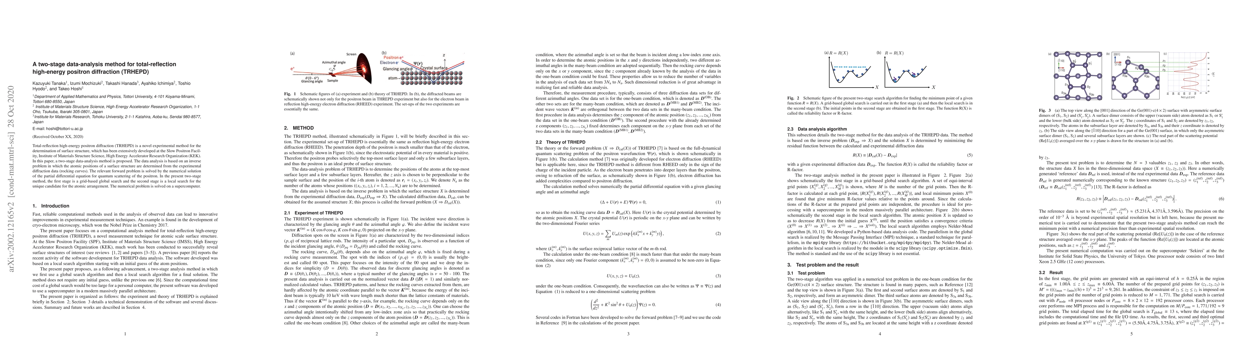 This paper proposes a two-stage data-analysis method for total-reflection high-energy positron diffraction (TRHEPD) to determine surface structure. The method involves a grid-based global search followed by a local search for the atomic arrangement, solved numerically on a supercomputer.