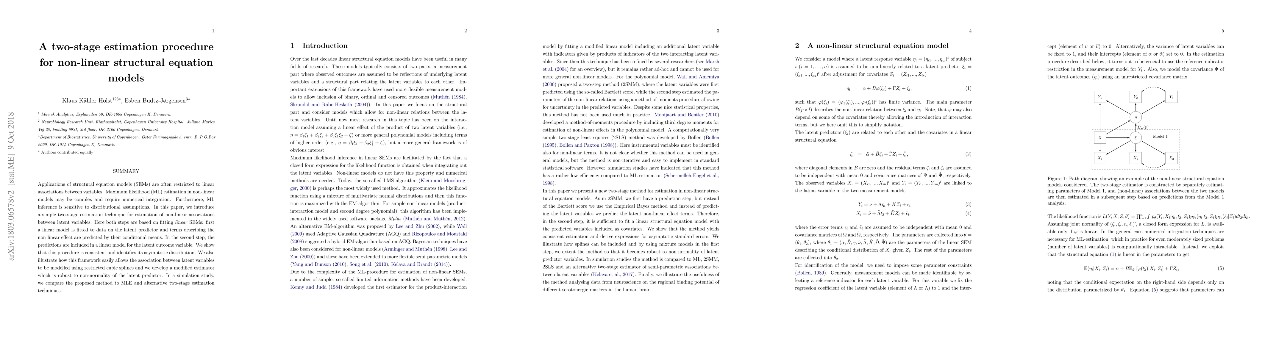 This paper proposes a two-stage estimation procedure for non-linear structural equation models, utilizing linear SEMs in each stage to simplify complex non-linear relationships. The method is shown to be consistent and robust to non-normality.