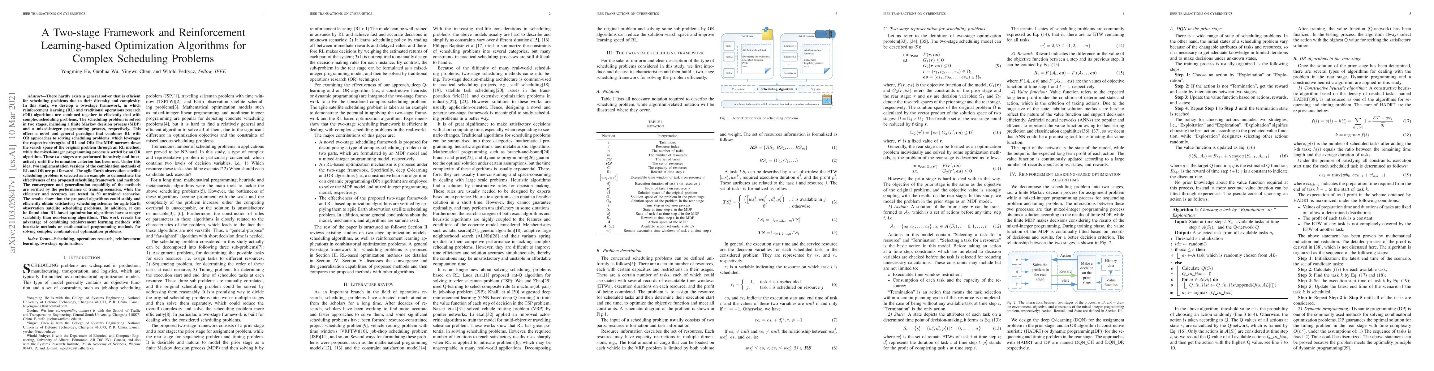 This paper proposes a two-stage framework combining reinforcement learning (RL) and traditional operations research (OR) algorithms to efficiently solve complex scheduling problems. The RL method narrows down the search space, while OR finalizes the solution via mixed-integer programming, demonstrating effectiveness and scalability through an agile Earth observation satellite scheduling example.