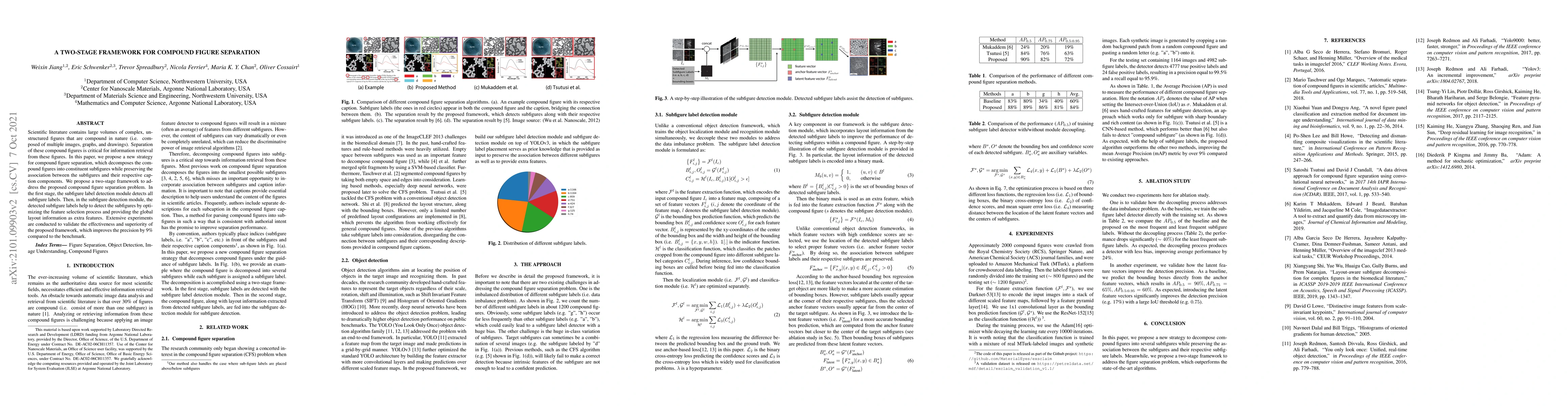 This paper proposes a two-stage framework for separating compound figures into constituent subfigures while maintaining their association with captions. The first stage detects subfigure labels, and the second stage uses these labels to optimize subfigure detection, improving detection precision by 9%.
