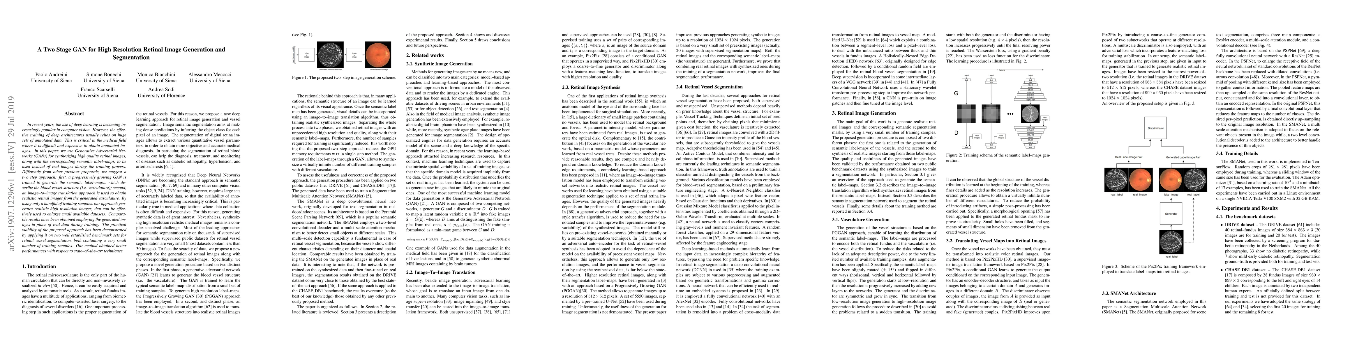 This paper proposes a two-stage GAN for generating high-resolution retinal images and corresponding semantic labels to augment limited training datasets in medical imaging. The method first generates vasculature maps and then uses an image-to-image translation to create realistic retinal images, achieving better performance than state-of-the-art techniques on benchmark datasets.
