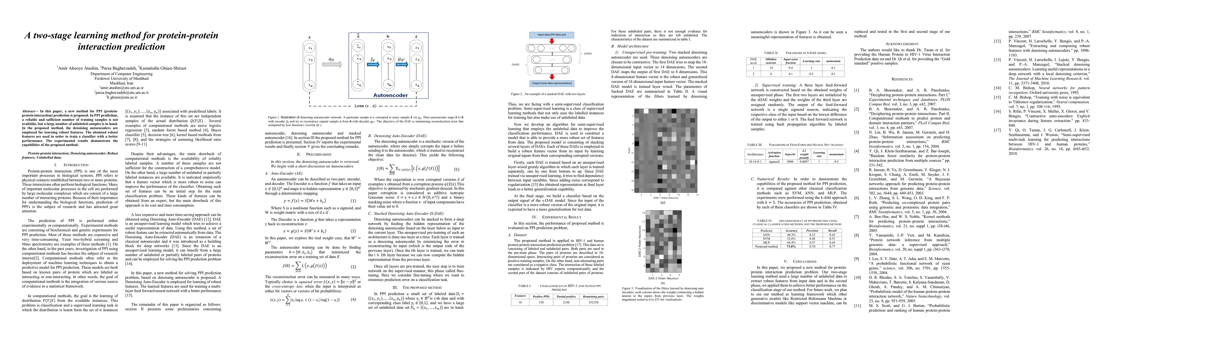 This paper proposes a two-stage learning method for protein-protein interaction prediction using denoising autoencoders to learn robust features from unlabeled data, which are then used to train a classifier for improved performance. Experimental results show the effectiveness of the proposed method.