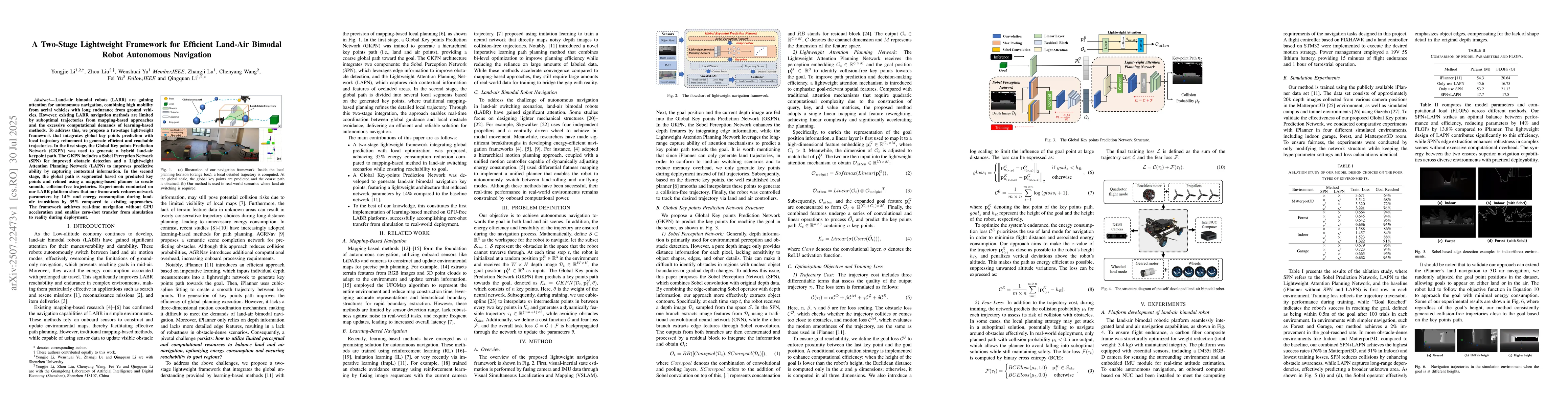 The research proposes a two-stage lightweight framework for efficient land-air bimodal robot autonomous navigation, integrating global key points prediction with local trajectory refinement. It utilizes a Global Keypoints Prediction Network (GKPN) that includes a Sobel Perception Network (SPN) for improved obstacle detection and a Lightweight Attention Planning Network (LAPN) to enhance predictive ability by capturing contextual information.