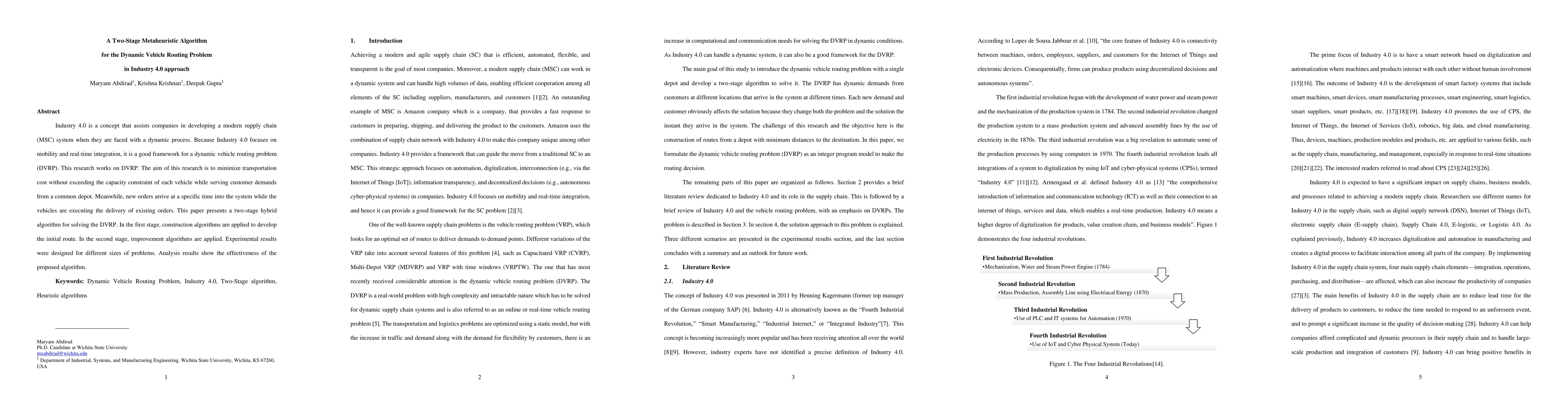 Industry 4.0 is a concept that assists companies in developing a modern supply chain (MSC) system when they are faced with a dynamic process. Because Industry 4.0 focuses on mobility and real-time integration, it is a good framework for a dynamic vehicle routing problem (DVRP). This research works on DVRP. The aim of this research is to minimize transportation cost without exceeding the capacity constraint of each vehicle while serving customer demands from a common depot. Meanwhile, new orders arrive at a specific time into the system while the vehicles are executing the delivery of existing orders. This paper presents a two-stage hybrid algorithm for solving the DVRP. In the first stage, construction algorithms are applied to develop the initial route. In the second stage, improvement algorithms are applied. Experimental results were designed for different sizes of problems. Analysis results show the effectiveness of the proposed algorithm.