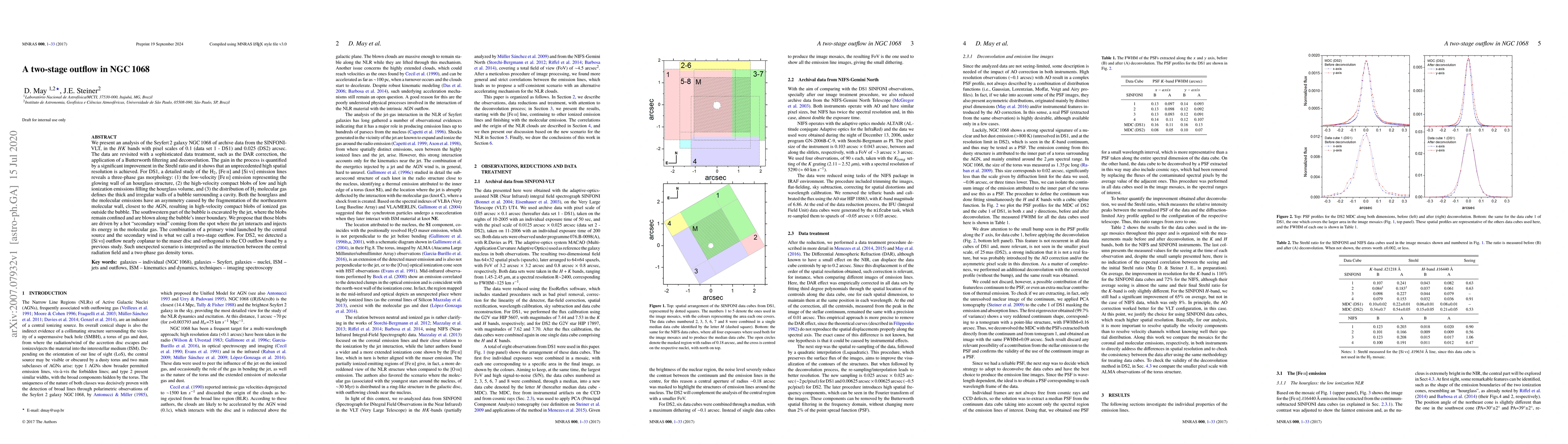 We present an analysis of the Seyfert 2 galaxy NGC 1068 with archive data from SINFONI-VLT, in the HK bands with pixel scales of 0.1 (data set 1 - DS1) and 0.025 (DS2) arcsec. The data are revisited with a sophisticated data treatment, such as the differential atmospheric refraction correction and the application of a Butterworth filtering and deconvolution. The gain in the process is quantified by a significant improvement in the Strehl ratio and it shows that an unprecedented high spatial resolution is achieved. For DS1, a detailed study of the H$_{2}$, [Fe II] and [Si VI] emission lines reveals a three-phase gas morphology: (1) the low-velocity [Fe II] emission representing the glowingwall of an hourglass structure, (2) the high-velocity compact blobs of low and high ionization emissions filling the hourglass volume and (3) the distribution of H$_{2}$ molecular gas defines the thick and irregular walls of a bubble surrounding a cavity. Both the hourglass and the molecular emissions have an asymmetry caused by the fragmentation of the north-eastern molecular wall, closest to the active galactic nucleus, resulting in highvelocity compact blobs of ionized gas outside the bubble. The south-western part of the bubble is excavated by the jet, where the blobs remain confined and are blown along the bubble's inner boundary. We propose that those blobs are driven by a hot "secondary wind" coming from the spot where the jet interacts and injects its energy in the molecular gas. The combination of a primary wind launched by the central source and the secondary wind is what we call a two-stage outflow. For DS2, we detected a [Si VI] outflow nearly coplanar to the maser disc and orthogonal to the CO outflow found by a previous study. Such unexpected scenario is interpreted as the interaction between the central radiation field and a two-phase gas density torus.