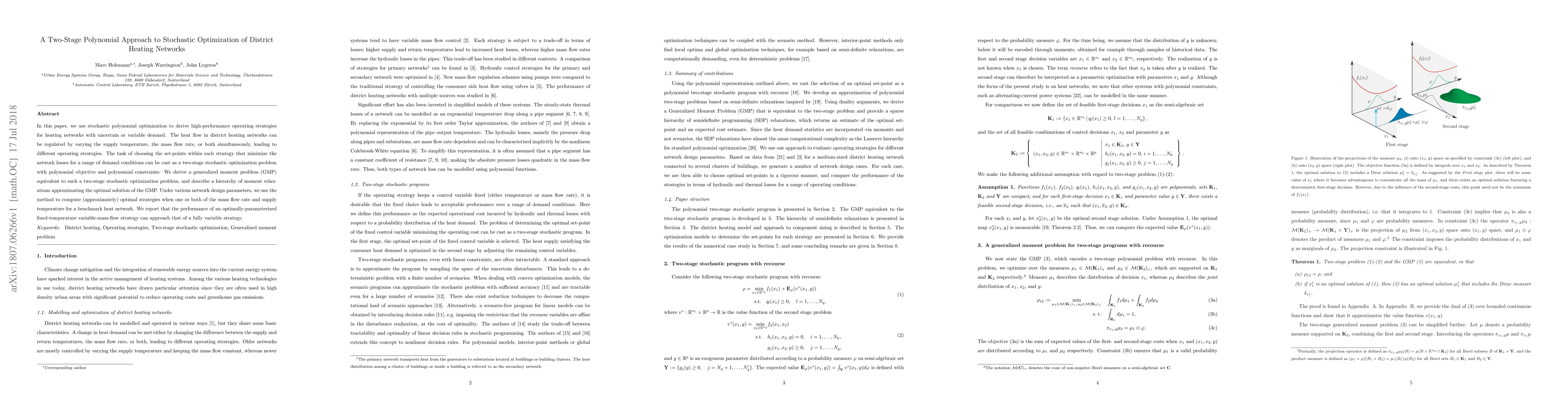 This paper proposes a two-stage polynomial optimization approach to develop high-performance strategies for district heating networks under uncertain demand. It uses a generalized moment problem to approximate optimal solutions and demonstrates that a fixed-temperature variable-mass-flow strategy can achieve near-optimal performance.