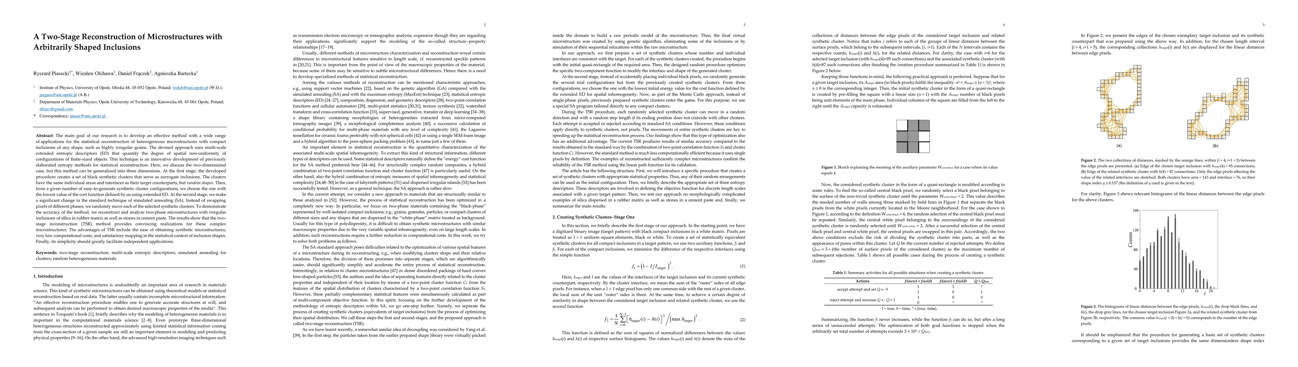 The main goal of our research is to develop an effective method with a wide range of applications for the statistical reconstruction of heterogeneous microstructures with compact inclusions of any shape, such as highly irregular grains. The devised approach uses multi-scale extended entropic descriptors (ED) that quantify the degree of spatial non-uniformity of configurations of finite-sized objects. This technique is an innovative development of previously elaborated entropy methods for statistical reconstruction. Here, we discuss the two-dimensional case, but this method can be generalized into three dimensions. At the first stage, the developed procedure creates a set of black synthetic clusters that serve as surrogate inclusions. The clusters have the same individual areas and interfaces as their target counterparts, but random shapes. Then, from a given number of easy-to-generate synthetic cluster configurations, we choose the one with the lowest value of the cost function defined by us using extended ED. At the second stage, we make a significant change in the standard technique of simulated annealing (SA). Instead of swapping pixels of different phases, we randomly move each of the selected synthetic clusters. To demonstrate the accuracy of the method, we reconstruct and analyze two-phase microstructures with irregular inclusions of silica in rubber matrix as well as stones in cement paste. The results show that the two-stage reconstruction (TSR) method provides convincing realizations for these complex microstructures. The advantages of TSR include the ease of obtaining synthetic microstructures, very low computational costs, and satisfactory mapping in the statistical context of inclusion shapes. Finally, its simplicity should greatly facilitate independent applications.