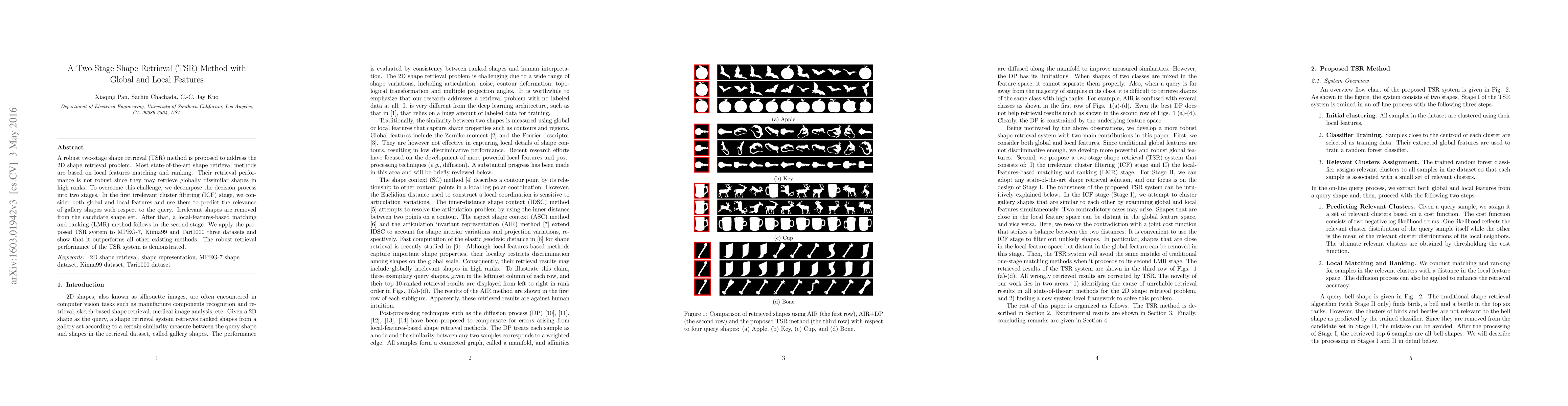 This paper proposes a two-stage shape retrieval method (TSR) that combines global and local features to improve retrieval performance. The first stage filters out irrelevant shapes using global and local features, while the second stage refines the search using local features, outperforming existing methods on multiple datasets.
