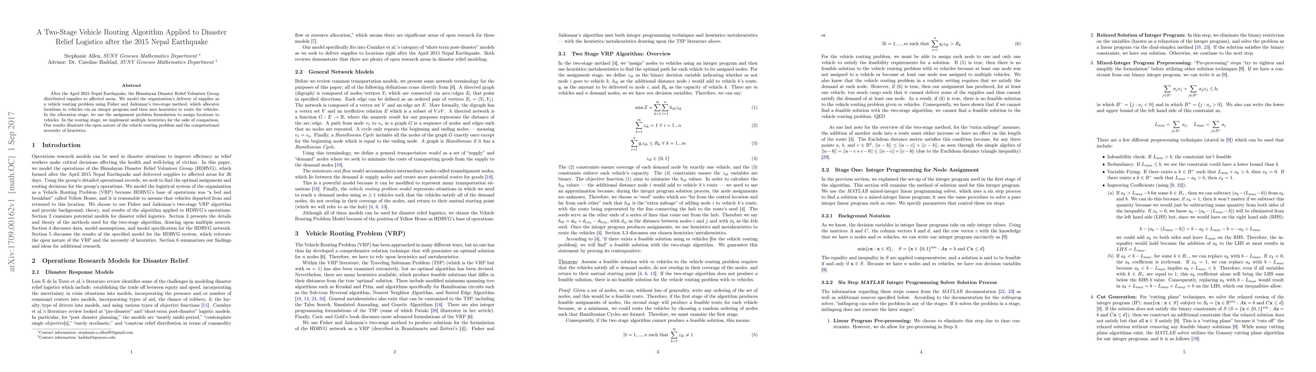 The paper models the disaster relief operations of Himalayan Disaster Relief Volunteer Group post-2015 Nepal Earthquake as a vehicle routing problem. Using Fisher and Jaikumar's two-stage method, it demonstrates the allocation via an integer program and routing through various heuristics, highlighting the problem's complexity and heuristic necessity.