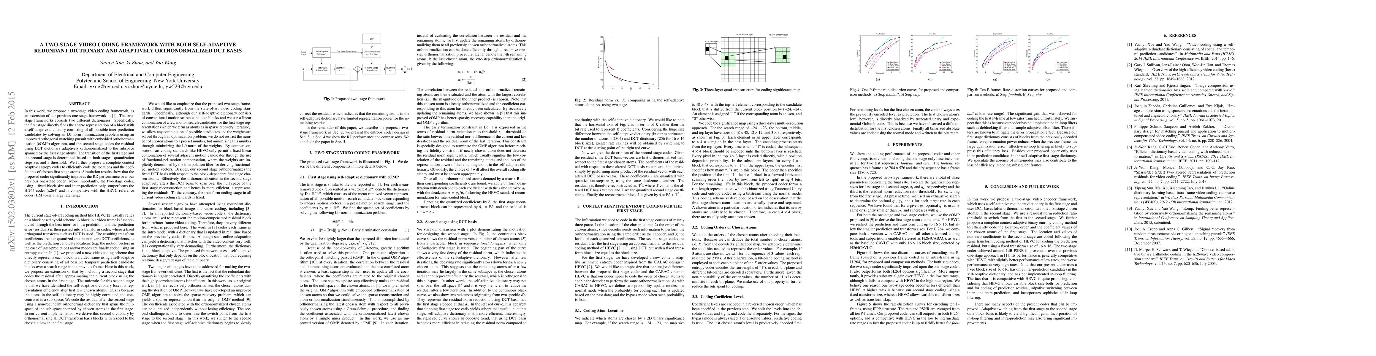 In this work, we propose a two-stage video coding framework, as an extension of our previous one-stage framework in [1]. The two-stage frameworks consists two different dictionaries. Specifically, the first stage directly finds the sparse representation of a block with a self-adaptive dictionary consisting of all possible inter-prediction candidates by solving an L0-norm minimization problem using an improved orthogonal matching pursuit with embedded orthonormalization (eOMP) algorithm, and the second stage codes the residual using DCT dictionary adaptively orthonormalized to the subspace spanned by the first stage atoms. The transition of the first stage and the second stage is determined based on both stages' quantization stepsizes and a threshold. We further propose a complete context adaptive entropy coder to efficiently code the locations and the coefficients of chosen first stage atoms. Simulation results show that the proposed coder significantly improves the RD performance over our previous one-stage coder. More importantly, the two-stage coder, using a fixed block size and inter-prediction only, outperforms the H.264 coder (x264) and is competitive with the HEVC reference coder (HM) over a large rate range.