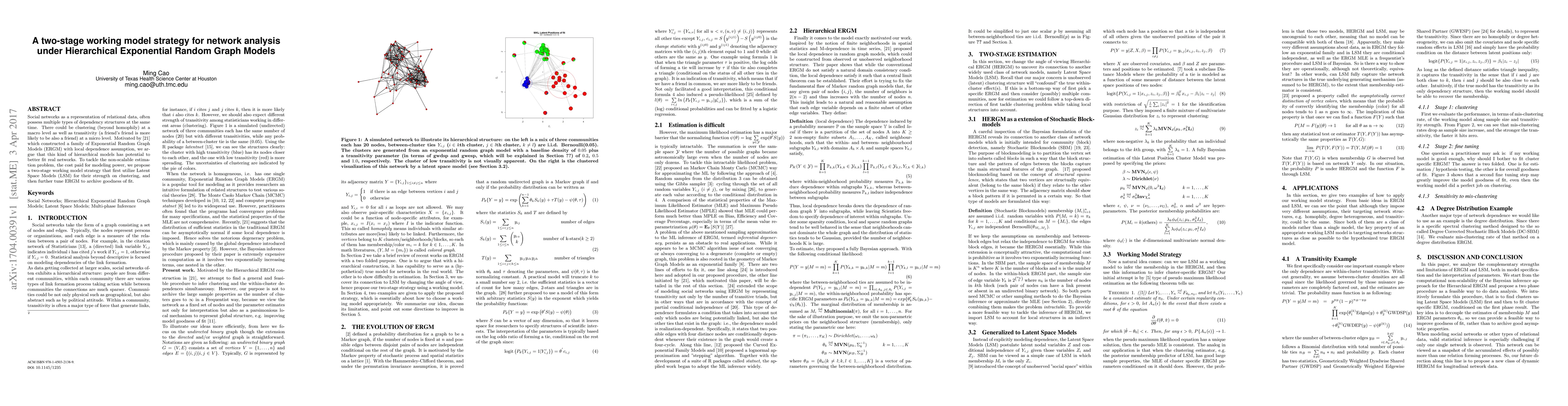 This paper proposes a two-stage working model strategy for analyzing hierarchical structures in social networks using Exponential Random Graph Models (ERGM). The first stage employs Latent Space Models (LSM) to capture clustering, followed by tuning ERGM for goodness of fit, addressing the scalability issue inherent in ERGMs.