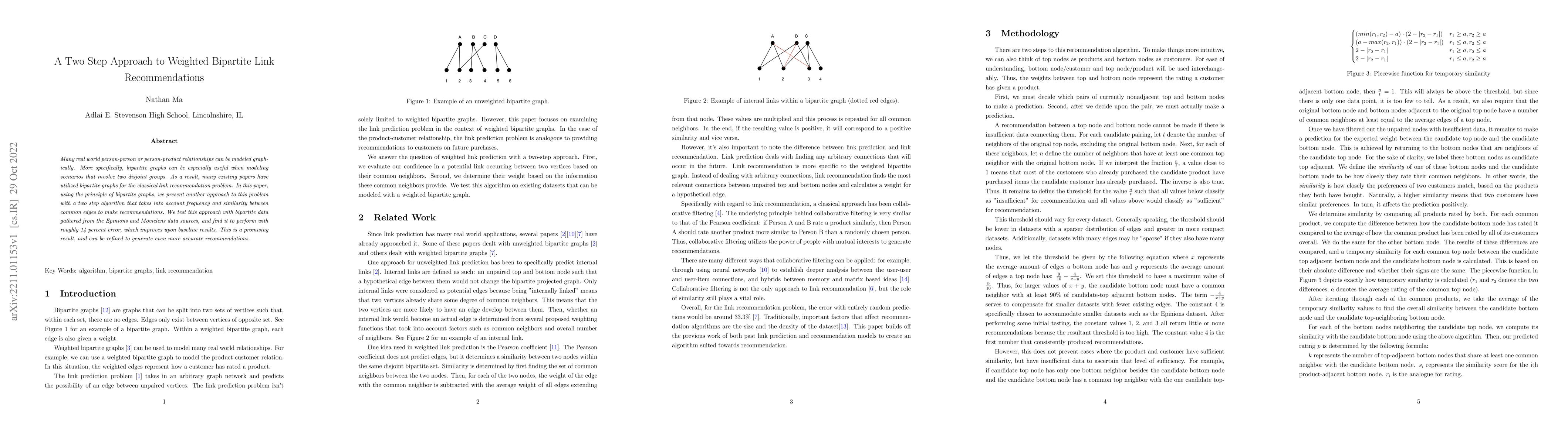 This paper proposes a two-step algorithm for weighted bipartite link recommendations, leveraging frequency and similarity to improve recommendation accuracy. Tested on Epinions and Movielens data, it reduces error by approximately 14 percent compared to baseline methods.