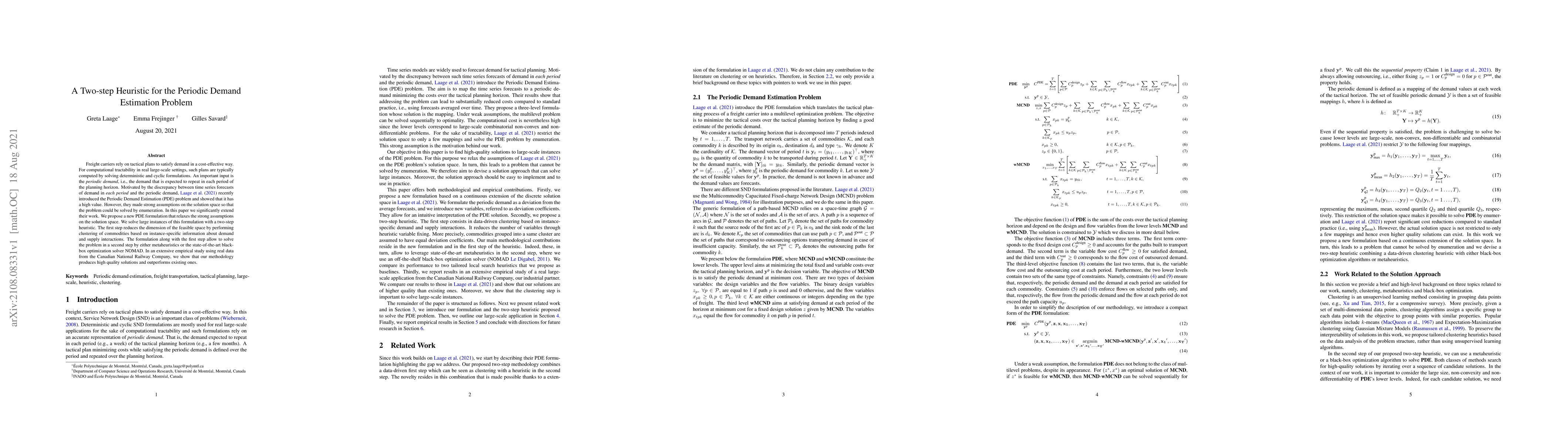This paper proposes a two-step heuristic to solve the Periodic Demand Estimation (PDE) problem, which aims to estimate demand that repeats over planning periods. The first step clusters commodities to reduce the feasible space, while the second step employs either metaheuristics or the NOMAD solver for optimization, outperforming existing methods in real-world data tests.