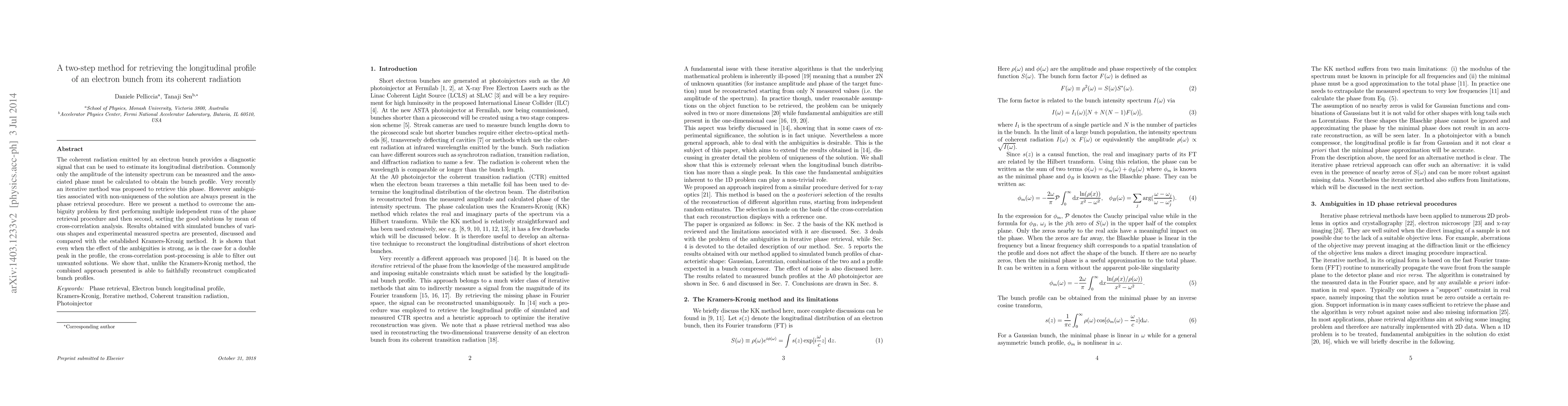 The paper introduces a two-step method to accurately retrieve the longitudinal profile of an electron bunch using its coherent radiation. The approach overcomes phase retrieval ambiguities by performing multiple independent runs and sorting solutions via cross-correlation analysis. It outperforms the Kramers-Kronig method in reconstructing complex bunch profiles, even with strong ambiguity effects.