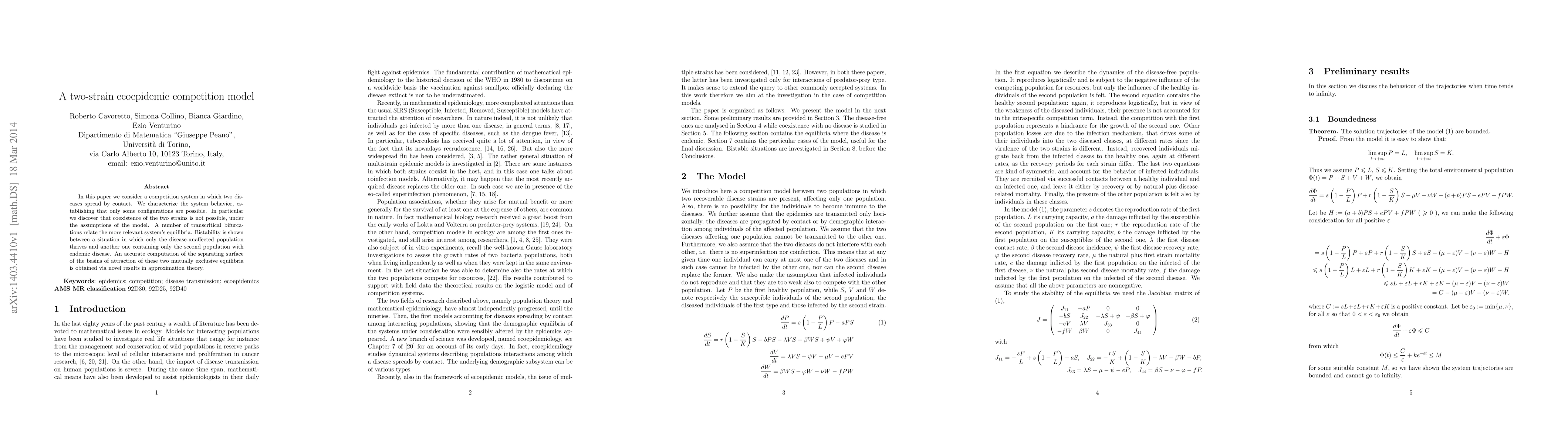The paper presents a two-strain ecoepidemic competition model, characterizing the system behavior and establishing that coexistence of the two strains is not possible under the model's assumptions.