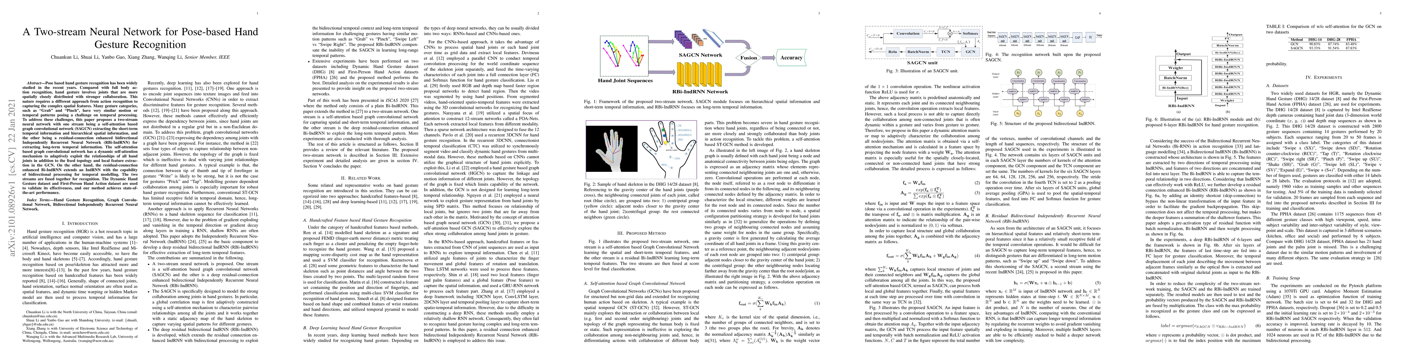 This paper proposes a two-stream neural network for pose-based hand gesture recognition, combining a self-attention based graph convolutional network for short-term temporal and spatial features, and a residual-connection enhanced bidirectional IndRNN for long-term temporal information, achieving state-of-the-art performance on Dynamic Hand Gesture and First-Person Hand Action datasets.