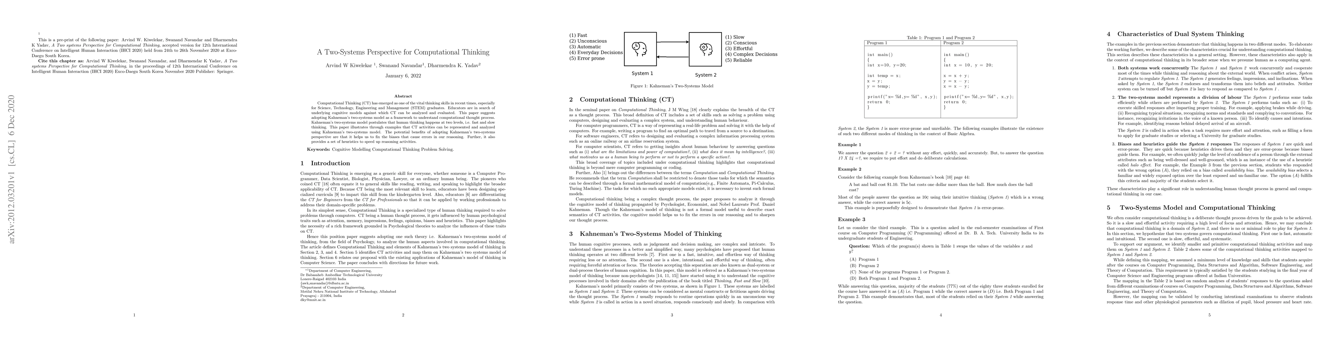 Computational Thinking (CT) has emerged as one of the vital thinking skills in recent times, especially for Science, Technology, Engineering and Management (STEM) graduates. Educators are in search of underlying cognitive models against which CT can be analyzed and evaluated. This paper suggests adopting Kahneman's two-systems model as a framework to understand the computational thought process. Kahneman's two-systems model postulates that human thinking happens at two levels, i.e. fast and slow thinking. This paper illustrates through examples that CT activities can be represented and analyzed using Kahneman's two-systems model. The potential benefits of adopting Kahneman's two-systems perspective are that it helps us to fix the biases that cause errors in our reasoning. Further, it also provides a set of heuristics to speed up reasoning activities.