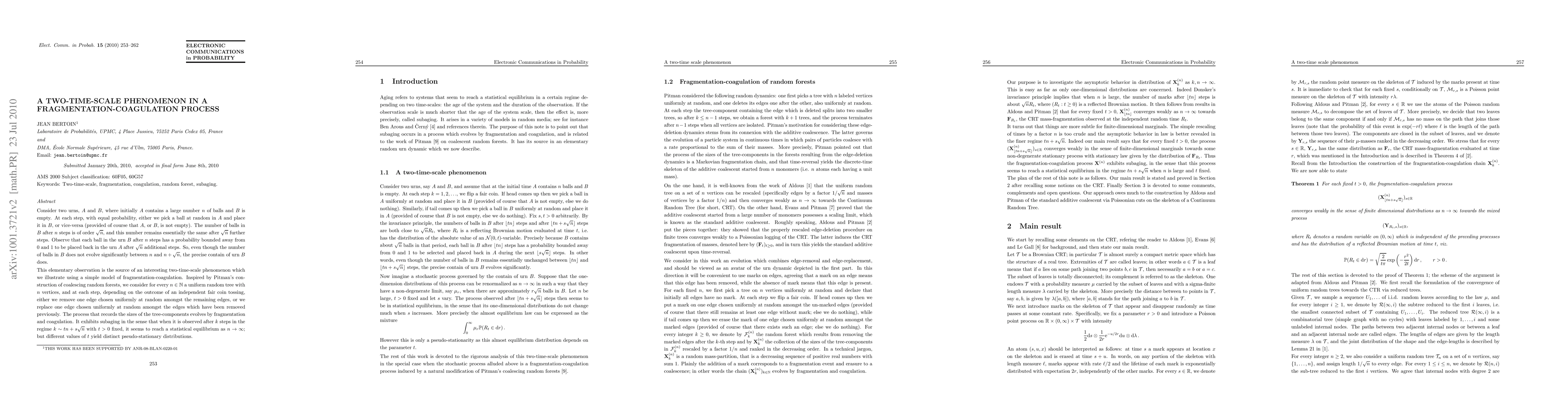 Consider two urns, $A$ and $B$, where initially $A$ contains a large number $n$ of balls and $B$ is empty. At each step, with equal probability, either we pick a ball at random in $A$ and place it in $B$, or vice-versa (provided of course that $A$, or $B$, is not empty). The number of balls in $B$ after $n$ steps is of order $\sqrt n$, and this number remains essentially the same after $\sqrt n$ further steps. Observe that each ball in the urn $B$ after $n$ steps has a probability bounded away from $0$ and $1$ to be placed back in the urn $A$ after $\sqrt n$ further steps. So, even though the number of balls in $B$ does not evolve significantly between $n$ and $n+\sqrt n$, the precise contain of urn $B$ does. This elementary observation is the source of an interesting two-time-scale phenomenon which we illustrate using a simple model of fragmentation-coagulation. Inspired by Pitman's construction of coalescing random forests, we consider for every $n\in \N$ a uniform random tree with $n$ vertices, and at each step, depending on the outcome of an independent fair coin tossing, either we remove one edge chosen uniformly at random amongst the remaining edges, or we replace one edge chosen uniformly at random amongst the edges which have been removed previously. The process that records the sizes of the tree-components evolves by fragmentation and coagulation. It exhibits subaging in the sense that when it is observed after $k$ steps in the regime $k\sim tn+s\sqrt n$ with $t>0$ fixed, it seems to reach a statistical equilibrium as $n\to\infty$; but different values of $t$ yield distinct pseudo-stationary distributions.