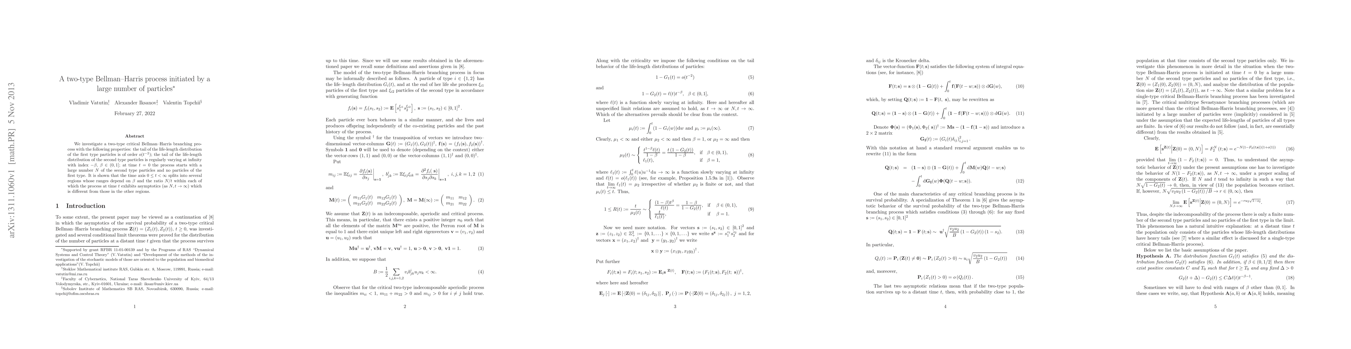 We investigate a two-type critical Bellman--Harris branching process with the following properties: the tail of the life-length distribution of the first type particles is of order $o(t^{-2})$; the tail of the life-length distribution of the second type particles is regularly varying at infinity with index $-\beta$, $\beta \in (0,1]$; at time $t=0$ the process starts with a large number $N$ of the second type particles and no particles of the first type. It is shown that the time axis $0\leq t<\infty $ splits into several regions whose ranges depend on $\beta $ and the ratio $N/t$ within each of which the process at time $t$ exhibits asymptotics (as $N,t\rightarrow \infty$) which is different from those in the other regions.