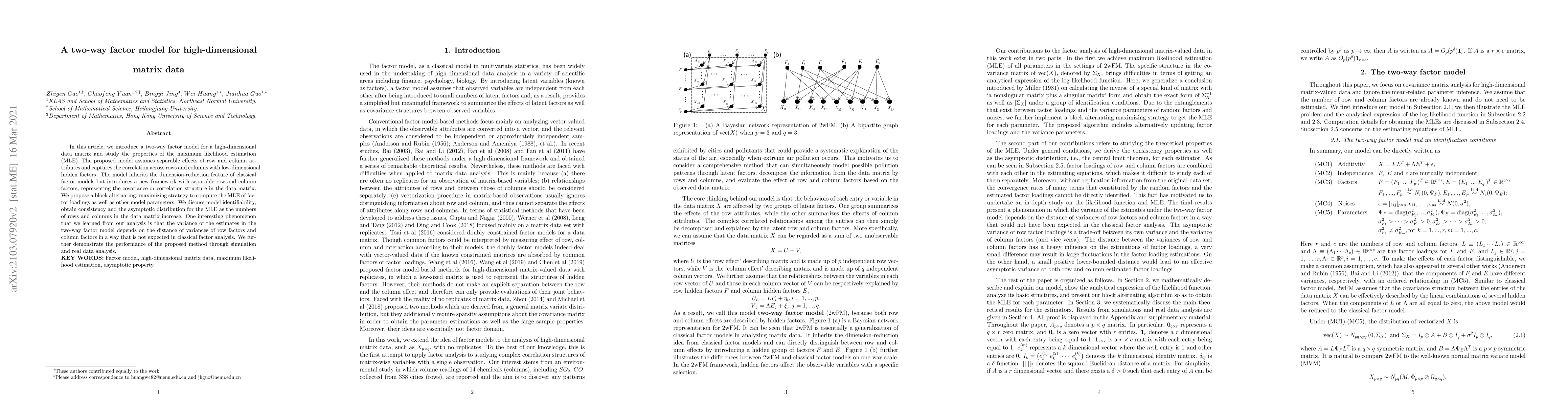 This paper proposes a two-way factor model for high-dimensional matrix data, introducing separable row and column effects to capture correlations. It employs a block alternating strategy to compute maximum likelihood estimates and discusses model properties, including identifiability, consistency, and asymptotic distribution.