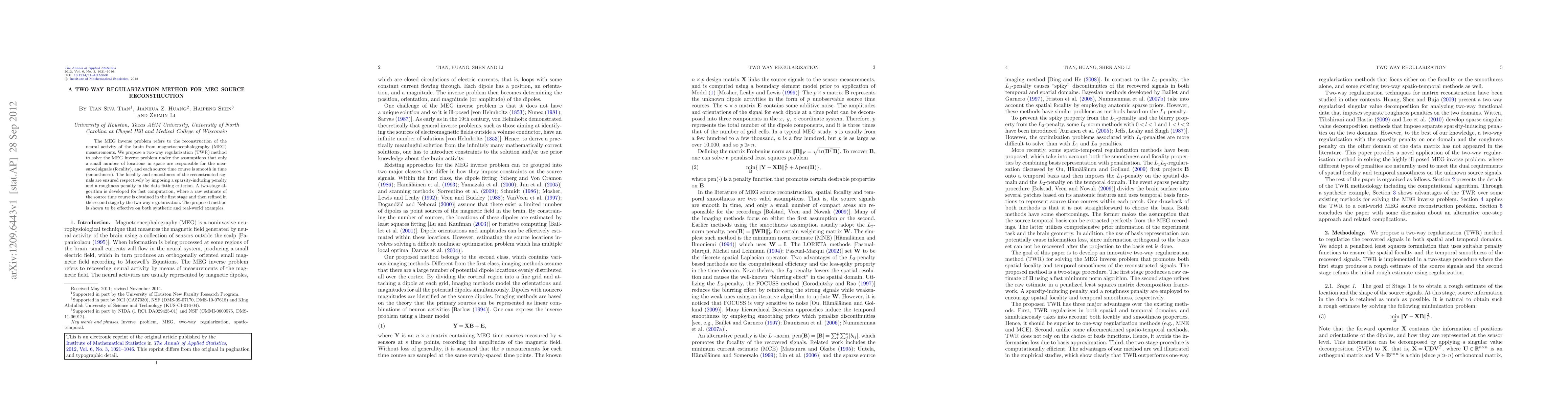 The paper proposes a two-way regularization method for MEG source reconstruction, combining sparsity and roughness penalties to ensure focality and smoothness. The method employs a two-stage algorithm for efficient computation and demonstrates effectiveness on both synthetic and real data.
