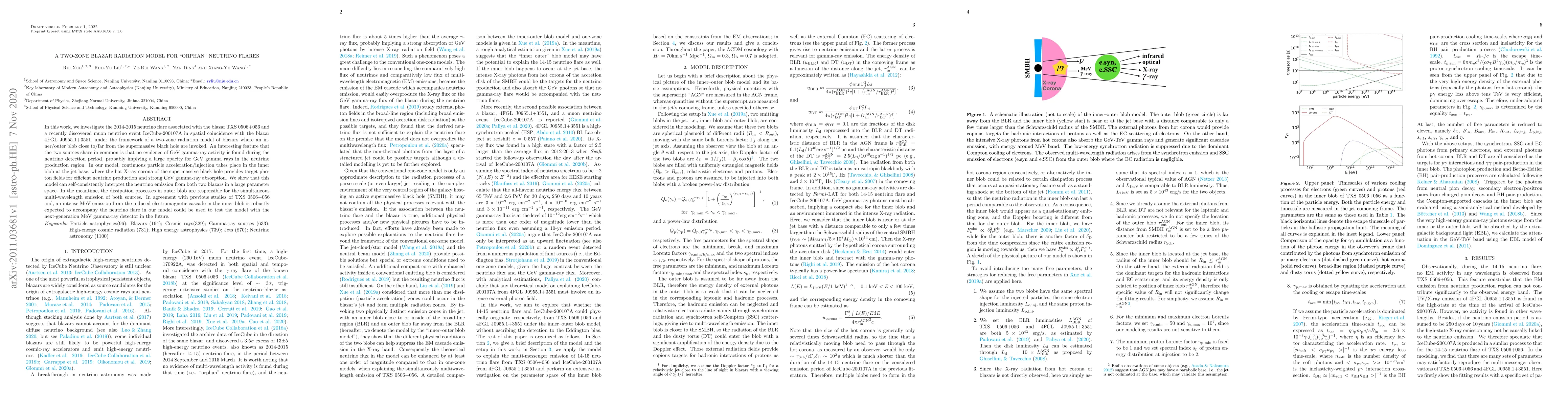 This research proposes a two-zone blazar model to explain 'orphan' neutrino flares from TXS 0506+056 and 4FGL J0955.1+3551, suggesting continuous particle acceleration in an inner blob near the black hole for efficient neutrino production and GeV gamma-ray absorption. The model also accounts for multi-wavelength emission from an outer blob, predicting intense MeV emission accompanying neutrino flares for future verification with MeV gamma-ray detectors.