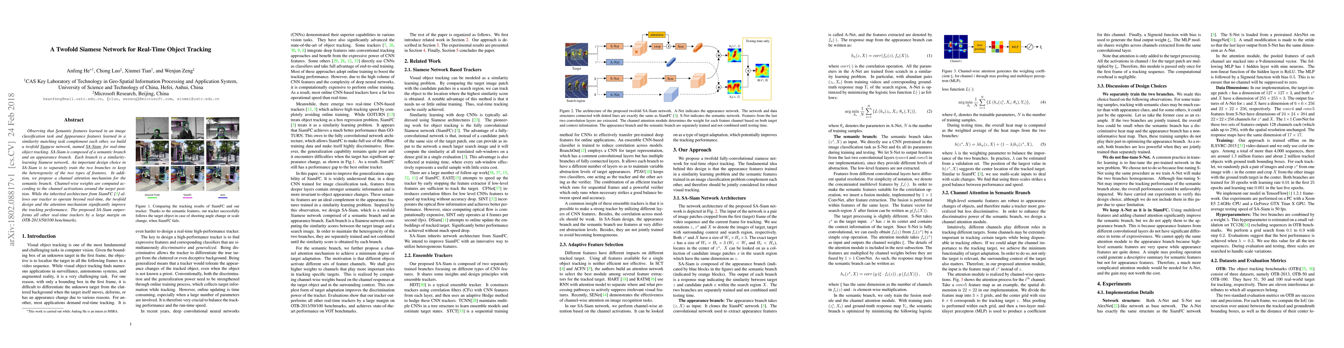 The paper proposes SA-Siam, a twofold Siamese network for real-time object tracking that combines semantic and appearance features. The design includes separate training for semantic and appearance branches and a channel attention mechanism, significantly improving tracking performance and outperforming other real-time trackers on multiple benchmarks.