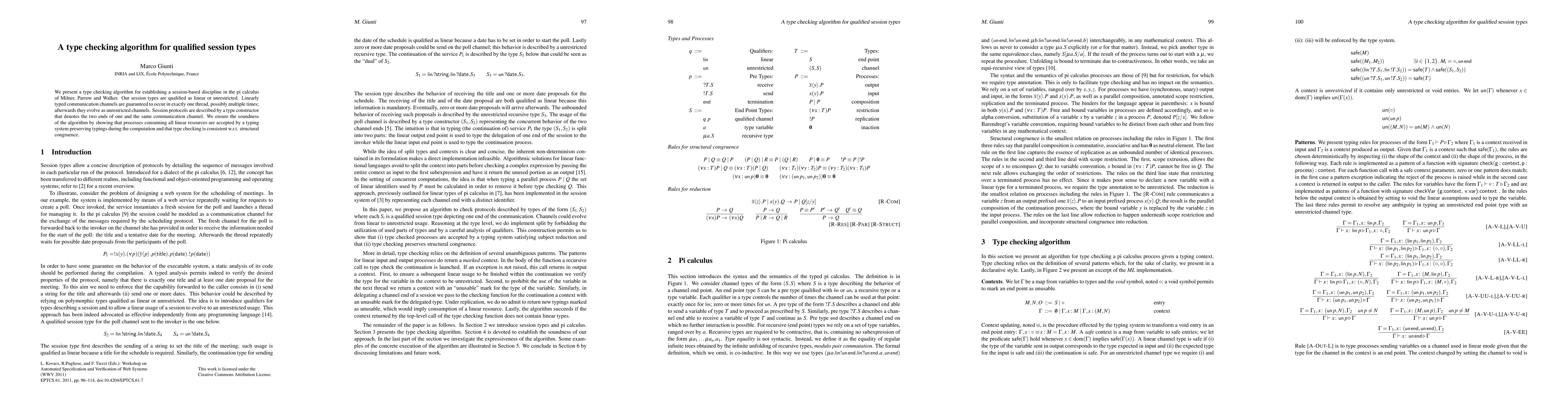 This paper introduces a type checking algorithm for qualified session types in the pi calculus, ensuring linear and unrestricted session protocols. It proves the algorithm's soundness by demonstrating acceptance of processes using only linear resources and maintaining type consistency through structural congruence.
