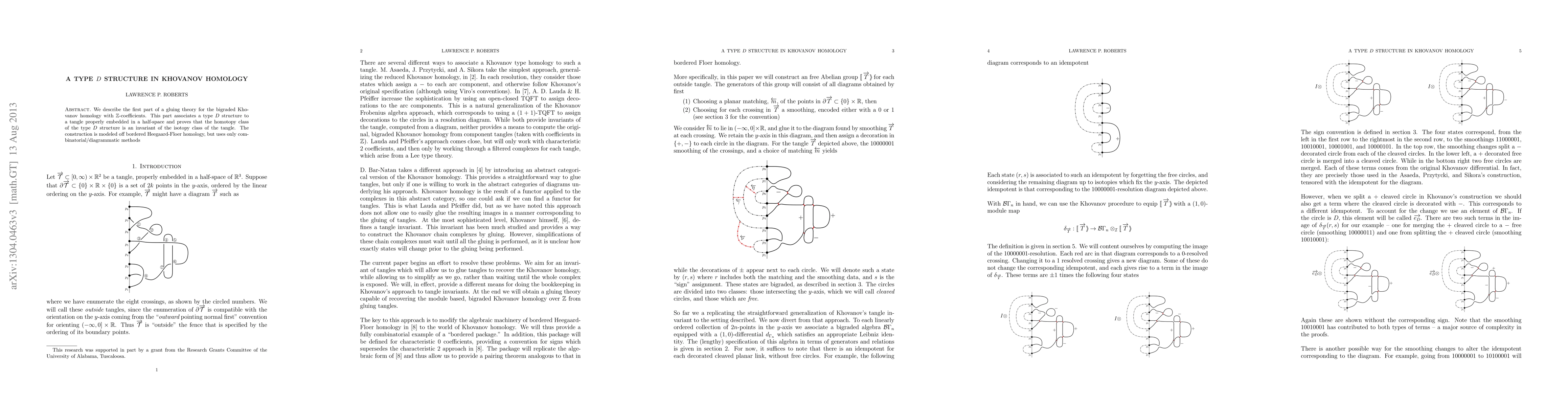 We describe the first part of a gluing theory for the bigraded Khovanov homology with integer coefficients. This part associates a type D structure to a tangle properly embedded in a half-space and proves that the homotopy class of the type D structure is an invariant of the isotopy class of the tangle. The construction is modeled off bordered Heegaard-Floer homology, but uses only combinatorial/diagrammatic methods