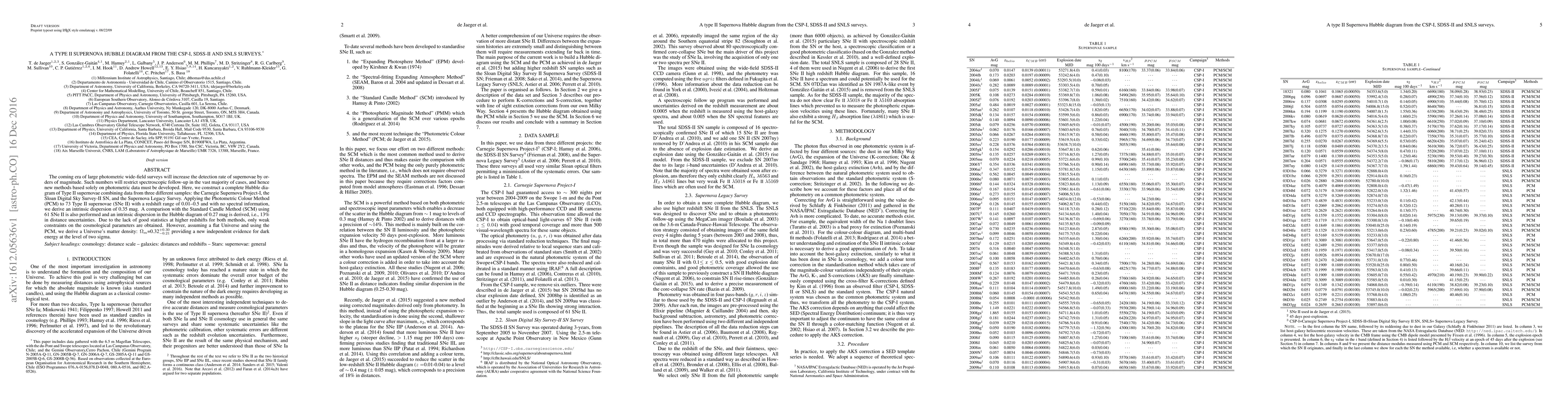 The coming era of large photometric wide-field surveys will increase the detection rate of supernovae by orders of magnitude. Such numbers will restrict spectroscopic follow-up in the vast majority of cases, and hence new methods based solely on photometric data must be developed. Here, we construct a complete Hubble diagram of Type II supernovae combining data from three different samples: the Carnegie Supernova Project-I, the Sloan Digital Sky Survey-II SN, and the Supernova Legacy Survey. Applying the Photometric Colour Method (PCM) to 73 Type II supernovae (SNe~II) with a redshift range of 0.01--0.5 and with no spectral information, we derive an intrinsic dispersion of 0.35 mag. A comparison with the Standard Candle Method (SCM) using 61 SNe~II is also performed and an intrinsic dispersion in the Hubble diagram of 0.27 mag is derived, i.e., 13\% in distance uncertainties. Due to the lack of good statistics at higher redshifts for both methods, only weak constraints on the cosmological parameters are obtained. However, assuming a flat Universe and using the PCM, we derive a Universe's matter density: $\Omega_{m}$=0.32$^{+0.30}_{-0.21}$ providing a new independent evidence for dark energy at the level of two sigma.
