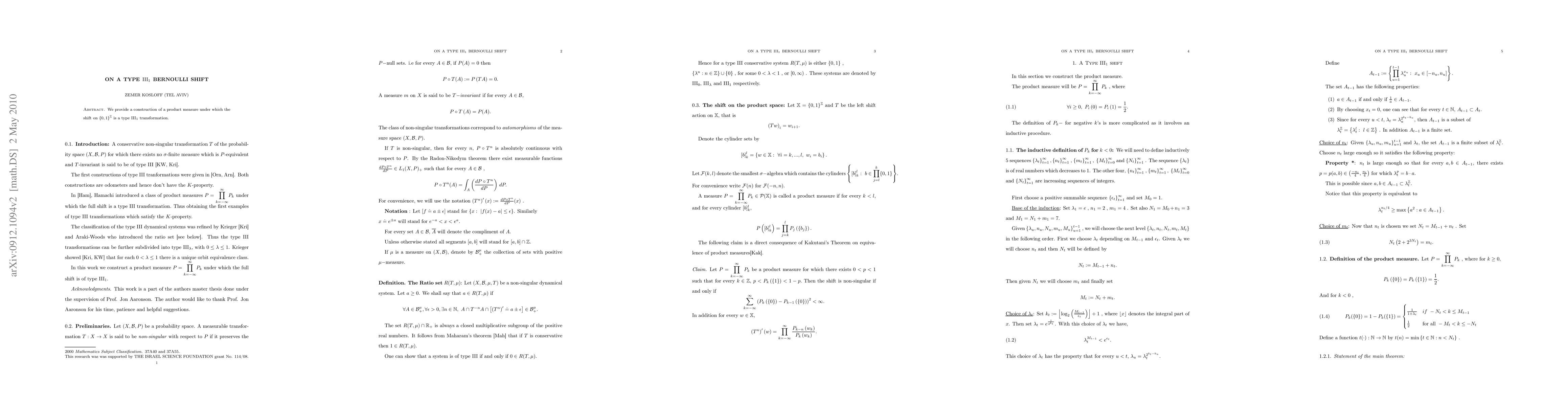 Summary: This paper constructs a product measure where the Bernoulli shift on a two-point product space operates as a type III_1 transformation, illustrating the complexities of dynamical systems.