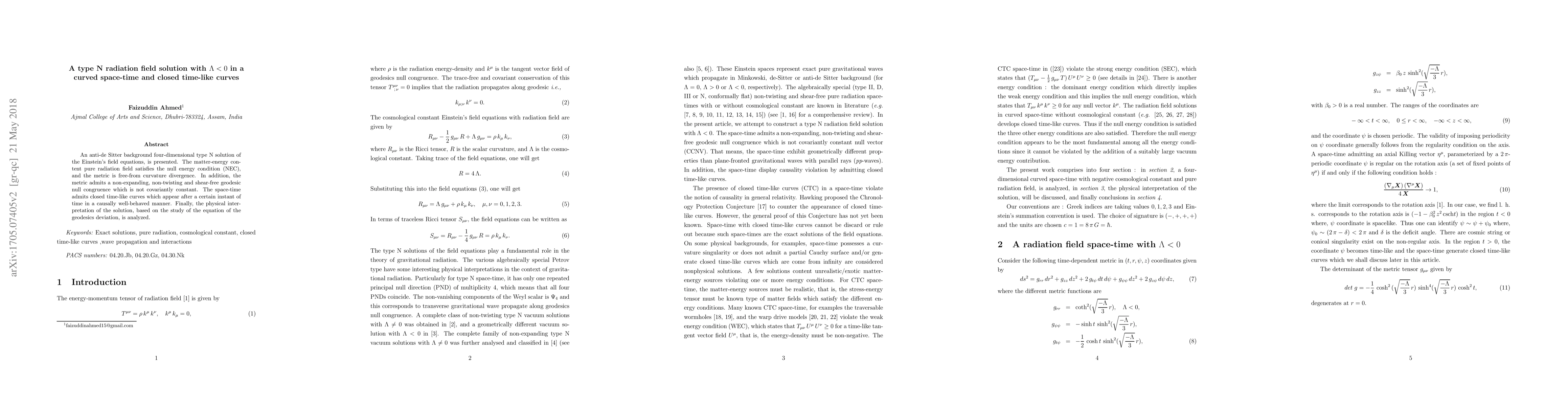 An anti-de Sitter background four-dimensional type N solution of the Einstein's field equations, is presented. The matter-energy content pure radiation field satisfies the null energy condition (NEC), and the metric is free-from curvature divergence. In addition, the metric admits a non-expanding, non-twisting and shear-free geodesic null congruence which is not covariantly constant. The space-time admits closed time-like curves which appear after a certain instant of time in a causally well-behaved manner. Finally, the physical interpretation of the solution, based on the study of the equation of the geodesics deviation, is analyzed.