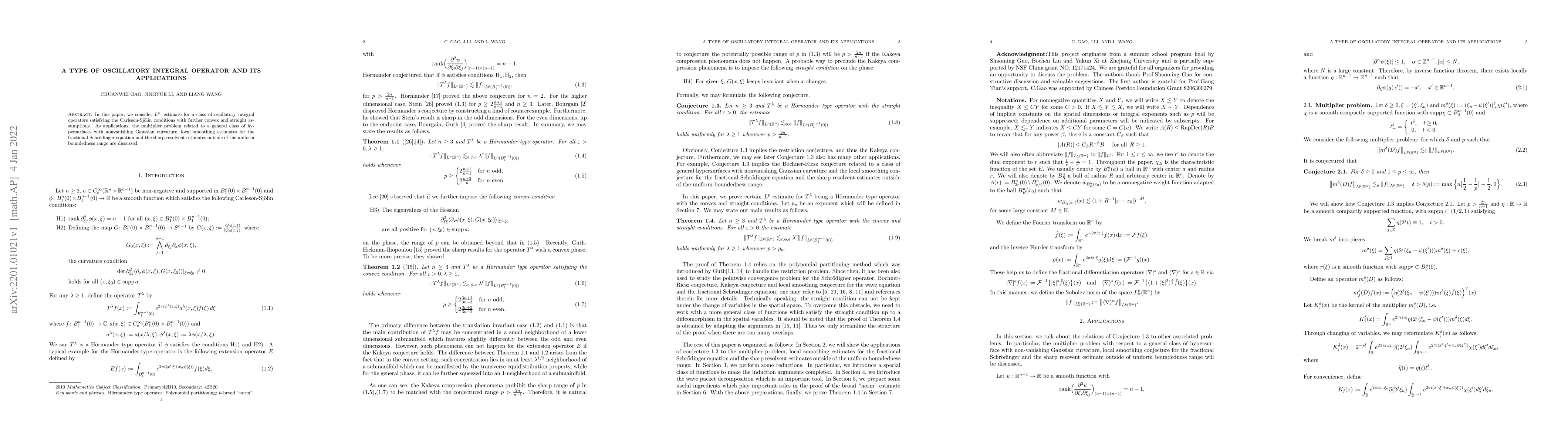 In this paper, we consider $L^p$- estimate for a class of oscillatory integral operators satisfying the Carleson-Sj\"olin conditions with further convex and straight assumptions. As applications, the multiplier problem related to a general class of hypersurfaces with nonvanishing Gaussian curvature, local smoothing estimates for the fractional Schr\"odinger equation and the sharp resolvent estimates outside of the uniform boundedness range are discussed.