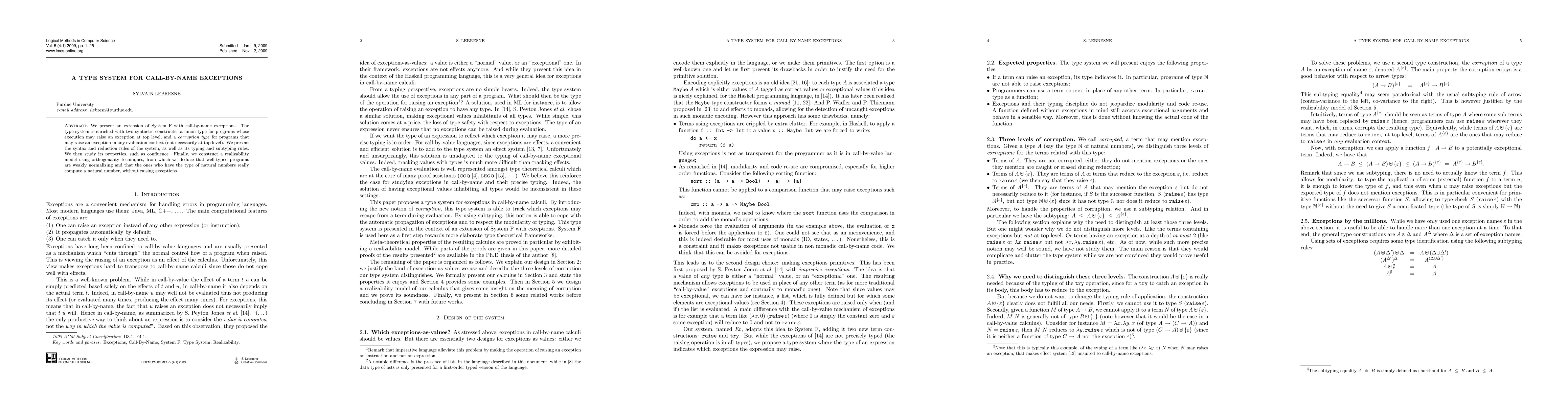 Researchers developed a type system for handling call-by-name exceptions in programming languages, which ensures that well-typed programs do not raise exceptions and can compute natural numbers without errors.