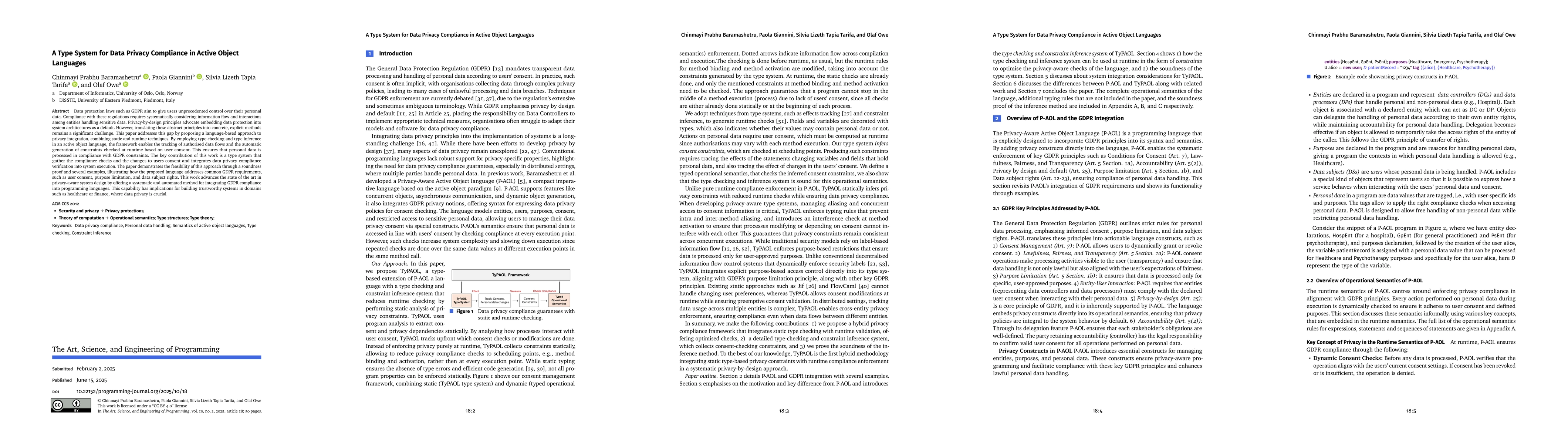 Data protection laws such as GDPR aim to give users unprecedented control over their personal data. Compliance with these regulations requires systematically considering information flow and interactions among entities handling sensitive data. Privacy-by-design principles advocate embedding data protection into system architectures as a default. However, translating these abstract principles into concrete, explicit methods remains a significant challenge. This paper addresses this gap by proposing a language-based approach to privacy integration, combining static and runtime techniques. By employing type checking and type inference in an active object language, the framework enables the tracking of authorised data flows and the automatic generation of constraints checked at runtime based on user consent. This ensures that personal data is processed in compliance with GDPR constraints. The key contribution of this work is a type system that gather the compliance checks and the changes to users consent and integrates data privacy compliance verification into system execution. The paper demonstrates the feasibility of this approach through a soundness proof and several examples, illustrating how the proposed language addresses common GDPR requirements, such as user consent, purpose limitation, and data subject rights. This work advances the state of the art in privacy-aware system design by offering a systematic and automated method for integrating GDPR compliance into programming languages. This capability has implications for building trustworthy systems in domains such as healthcare or finance, where data privacy is crucial.