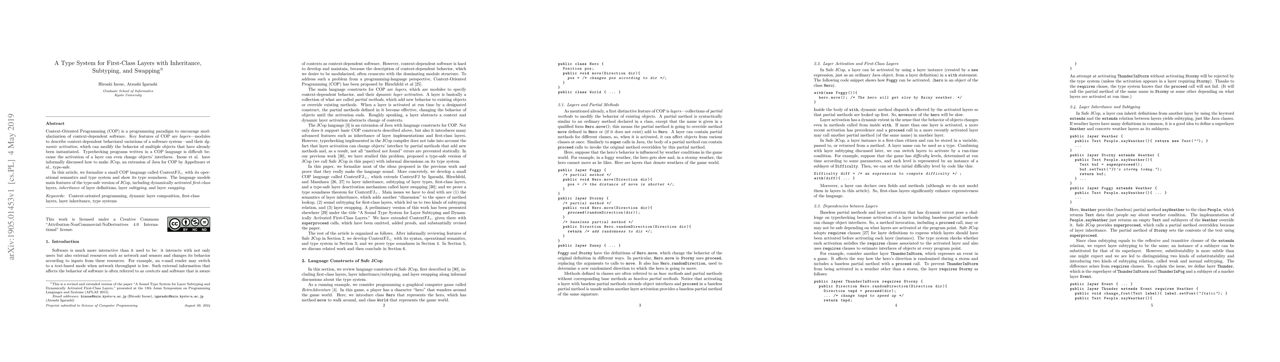 Context-Oriented Programming (COP) is a programming paradigm to encourage modularization of context-dependent software. Key features of COP are layers---modules to describe context-dependent behavioral variations of a software system---and their dynamic activation, which can modify the behavior of multiple objects that have already been instantiated. Typechecking programs written in a COP language is difficult because the activation of a layer can even change objects' interfaces. Inoue et al. have informally discussed how to make JCop, an extension of Java for COP by Appeltauer et al., type-safe. In this article, we formalize a small COP language called ContextFJ$_{<:}$ with its operational semantics and type system and show its type soundness. The language models main features of the type-safe version of JCop, including dynamically activated first-class layers, inheritance of layer definitions, layer subtyping, and layer swapping.