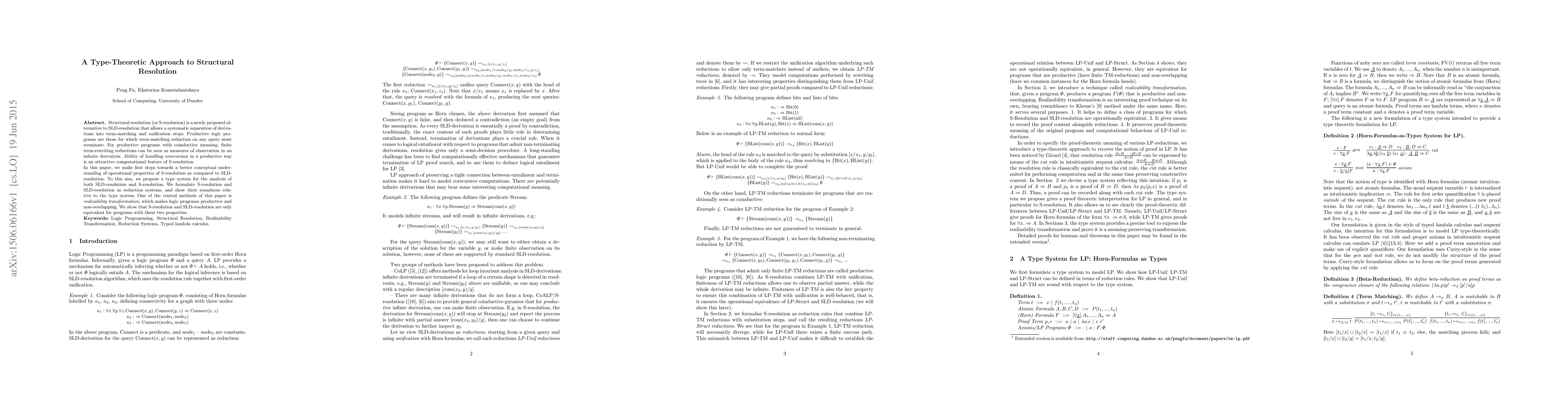 Structural resolution (or S-resolution) is a newly proposed alternative to SLD-resolution that allows a systematic separation of derivations into term-matching and unification steps. Productive logic programs are those for which term-matching reduction on any query must terminate. For productive programs with coinductive meaning, finite term-rewriting reductions can be seen as measures of observation in an infinite derivation. Ability of handling corecursion in a productive way is an attractive computational feature of S-resolution. In this paper, we make first steps towards a better conceptual understanding of operational properties of S-resolution as compared to SLD-resolution. To this aim, we propose a type system for the analysis of both SLD-resolution and S-resolution. We formulate S-resolution and SLD-resolution as reduction systems, and show their soundness relative to the type system. One of the central methods of this paper is realizability transformation, which makes logic programs productive and non-overlapping. We show that S-resolution and SLD-resolution are only equivalent for programs with these two properties.