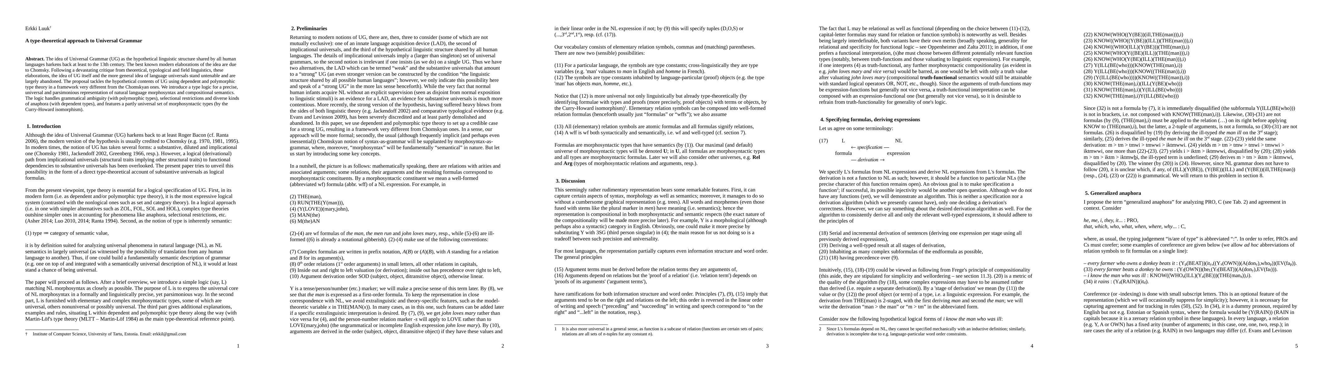 The idea of Universal Grammar (UG) as the hypothetical linguistic structure shared by all human languages harkens back at least to the 13th century. The best known modern elaborations of the idea are due to Chomsky. Following a devastating critique from theoretical, typological and field linguistics, these elaborations, the idea of UG itself and the more general idea of language universals stand untenable and are largely abandoned. The proposal tackles the hypothetical contents of UG using dependent and polymorphic type theory in a framework very different from the Chomskyan ones. We introduce a type logic for a precise, universal and parsimonious representation of natural language morphosyntax and compositional semantics. The logic handles grammatical ambiguity (with polymorphic types), selectional restrictions and diverse kinds of anaphora (with dependent types), and features a partly universal set of morphosyntactic types (by the Curry-Howard isomorphism).
